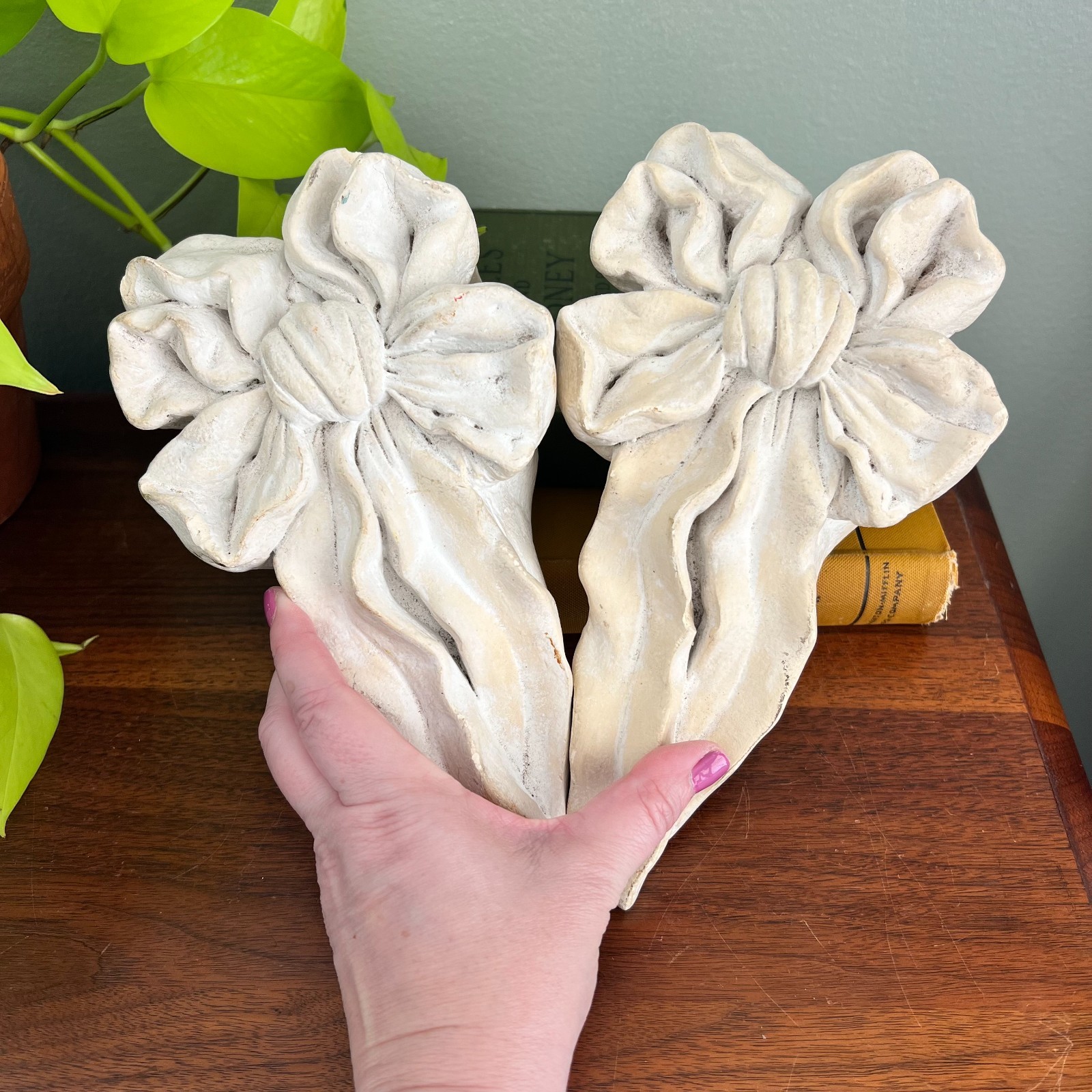 Vintage plaster curtain rod brackets featuring a sculptural ribbon bow design. Each bracket accommodates approximately a 2 inch diameter curtain rod, making them suitable for substantial decorative rods and heavier window treatments. Measuring approximately 9.5 inches in length, these are statement architectural pieces rather than standard lightweight hardware. Likely dating to the late 1970s–1980s French provincial revival era. Solid cast composition with natural aged patina that complements traditional, European, and cottage interiors. Sold as a pair. Condition: Good vintage condition with light surface wear consistent with age. Minor rusting visible around mounting hardware. No major cracks observed. Please review photos for detail. A beautiful architectural accent for restoring vintage homes or adding character to modern spaces.