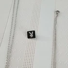 This vintage Playboy jewelry set is a stunning addition to any collection. The black enamel pendant necklace features a matching bracelet and pin, all made of silver metal. The set includes a necklace, bracelet, pin, and pendant, and is an original piece. The black and silver color combo adds a touch of elegance to the set, making it perfect for any occasion. The set is categorized under Jewelry & Watches and Vintage & Antique Jewelry, and is sure to make a statement.