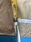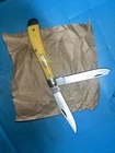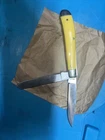 This vintage pocket knife by Schrade is a rare find for collectors. Featuring two blades, this yellow Old Timer knife is perfect for any outdoor enthusiast. With its factory manufactured design, it's a great addition to any knife collection. The knife is in new condition, however, it has been opened from its original packaging. Don't miss out on the opportunity to add this unique piece to your collection. S130