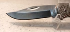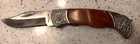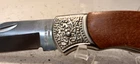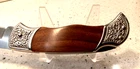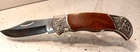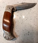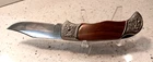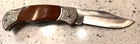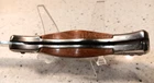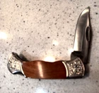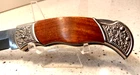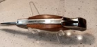 From my brother's collection: 7 1/4" open length, 4" closed, 1 1/2" width O.A., 3/4" thick because the wood is beautifully bowed in its construction. This is an impressive pocket knife and ready to be on display in any avid collectors treasured bounty of unique cutlery. I must down-size and so must pass on things I treasure from things passed on to me from my family. My brother's knife, sword, spear collection was vast and varied, along with other memorabilia from science fiction movies etc. I post items as I unwrap them from there carefully wrapped boxes. If you have room for this awesome pocket knife, it is priced appropriately and awaits it's place in your collection. Thank you for visiting!