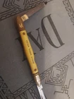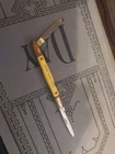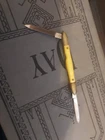 Vintage Colonial USA pocket knife with a thin yellow bone handle. This manual opening knife features two carbon steel pen blades under 2.75 inches. It is ambidextrous with a slipjoint lock mechanism, making it suitable for everyday carry. The knife is a collectible piece from Pete's Cigar Store, showcasing craftsmanship from the United States.