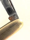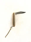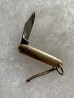 This vintage pocket knife is a beautiful piece with its gold and silver finish. The knife features one blade and a brass handle, making it a great addition to any collection. The knife is also a great option for those who enjoy vintage items. It comes with a chain, making it easy to carry around. It has patina.