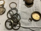 Vintage pocket watches and parts. One watch is a Lucien Pedre.