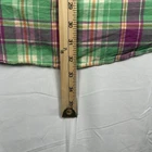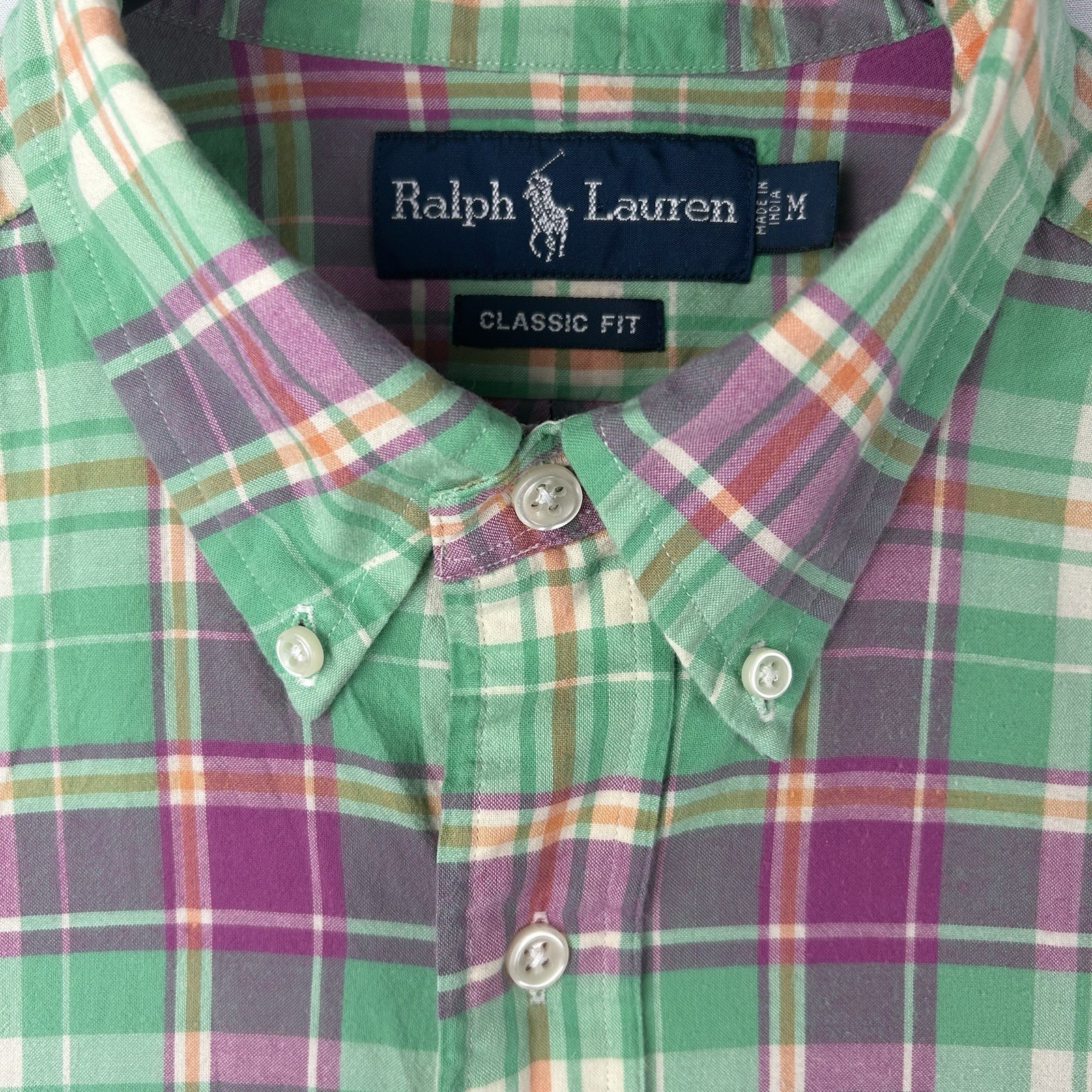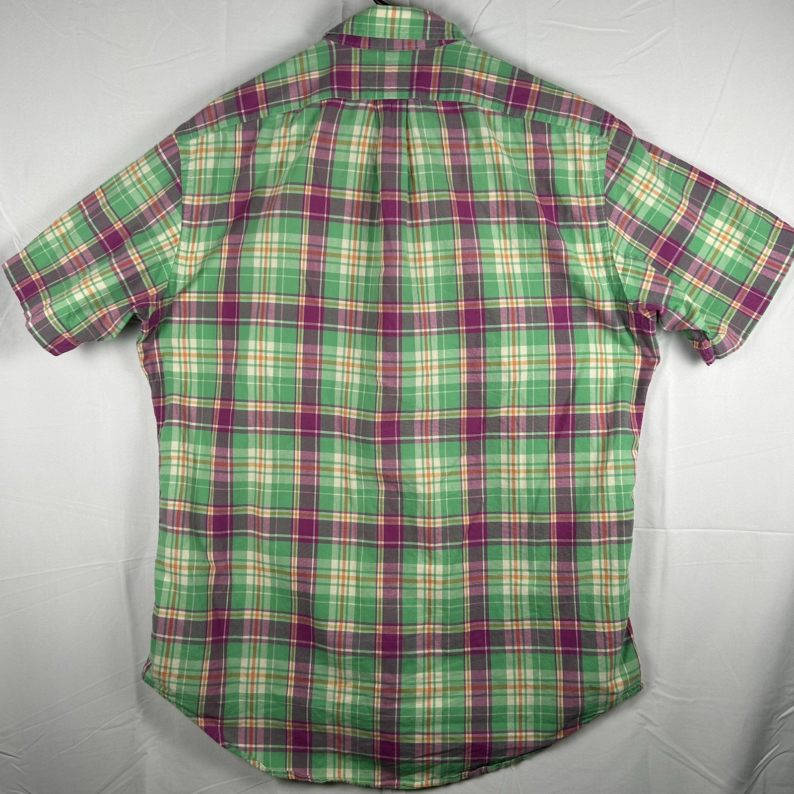 The Vintage Polo Ralph Lauren Short Sleeve Button Shirt in Men's Medium Classic Fit is a classic piece with a collared neckline, short sleeves, and button-up style. Made from cotton fabric, this woven shirt features a plaid pattern and embroidered accents, reflecting a 90s preppy theme. It is suitable for casual occasions in all seasons and is machine washable for easy care. With a chest size of 48 inches, this shirt is a timeless addition to any man's wardrobe, showcasing the iconic Polo Ralph Lauren brand and offering a comfortable fit for everyday wear.