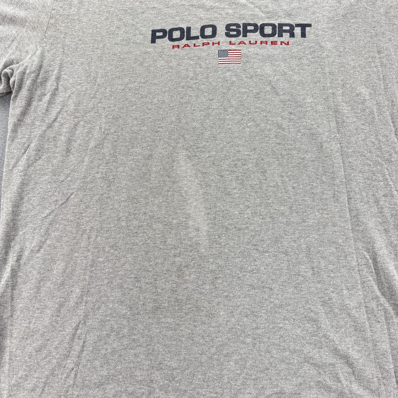 Polo Sport Ralph Lauren Shirt Mens Large Gray Spell Out Logo USA Flag Tee Condition: Good used condition with light wear, minor faint mark on front as shown in photos Classic Polo Sport Ralph Lauren spell out logo printed across chest with small embroidered American flag underneath Tag size: Large (Mens) Color: Gray Material: 100% Cotton Made in Honduras Iconic Polo Sport style, perfect for casual wear or collectors of vintage Ralph Lauren See all photos for details and measurements