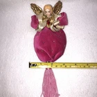 This is what appears to be a Vintage Christmas Ornament featuring a porcelain Angel. Her head, hands and wings are all porcelain. Her gown is a pink/Fuchsia color of crushed velvet. It is decorated with gold colored beads and finished at the bottom with a pink tassel. I did not find any hallmarks/branding on the ornament. She is approximately 9 inches long and about 3.5 inches wide. Angel ornament is in good pre-owned condition with no chips, nicks or tears. Please see all photos for additional details, views and measurements. Shipped via USPS Ground Advantage.