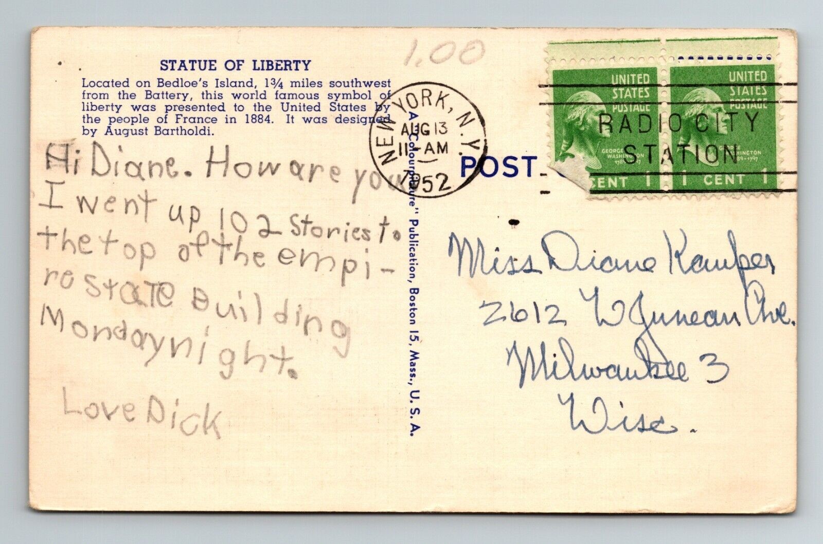 This vintage Statue of Liberty postcard is a charming piece of history! The image captures Lady Liberty beautifully, and the seller’s careful packaging ensures it arrives in perfect condition. Love that combined shipping makes collecting multiple postcards even better—great deal for collectors! Fast shipping and excellent service. Highly recommend!