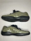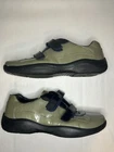 The Vintage Prada America's Cup Gold Leather Strap Sneakers are a stylish and luxurious option for men looking for a unique and high-quality shoe. Featuring a sleek gold color and leather outsole, these sneakers exude a sophisticated and sporty vibe. The Prada America's Cup model adds a touch of prestige to the design, making them a standout choice for those who appreciate fine craftsmanship and a touch of metal theme. Perfect for casual wear, these sneakers would make a statement with their elegant design and distinctive features.