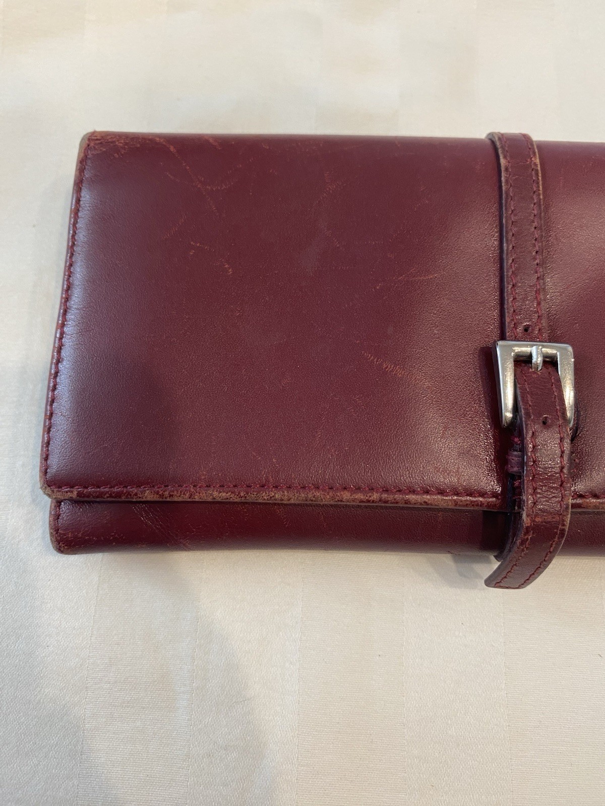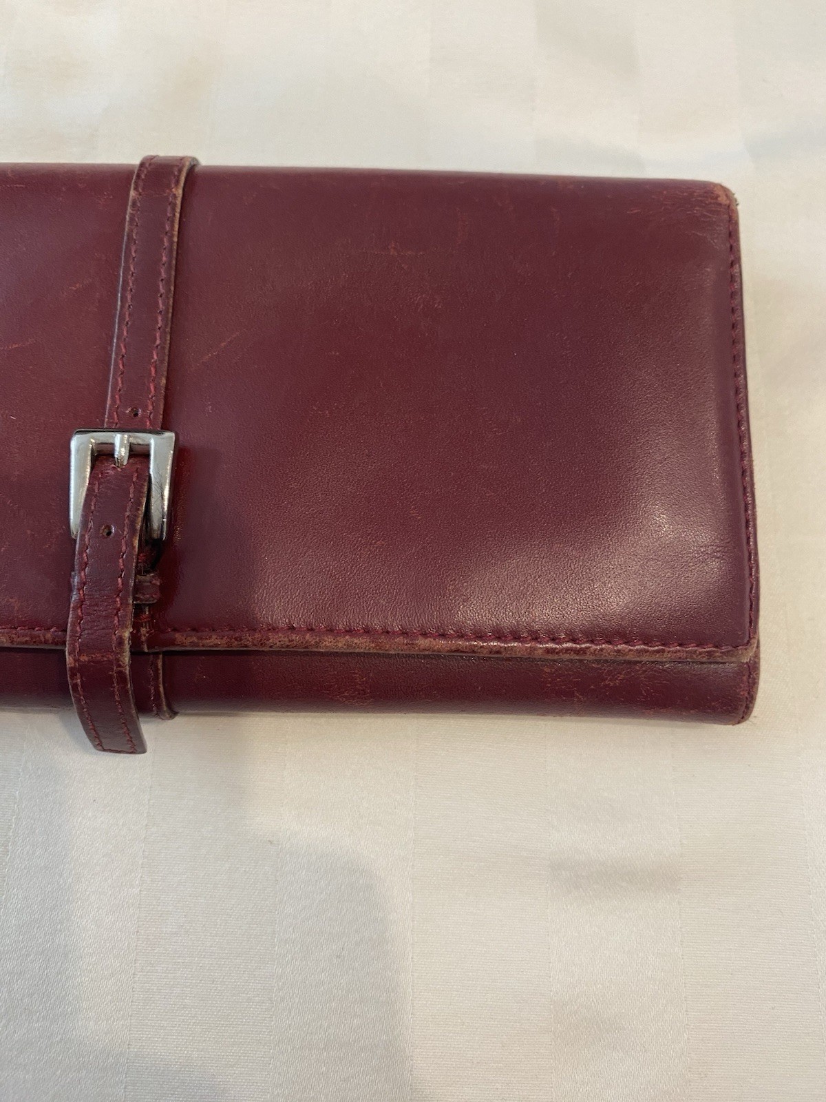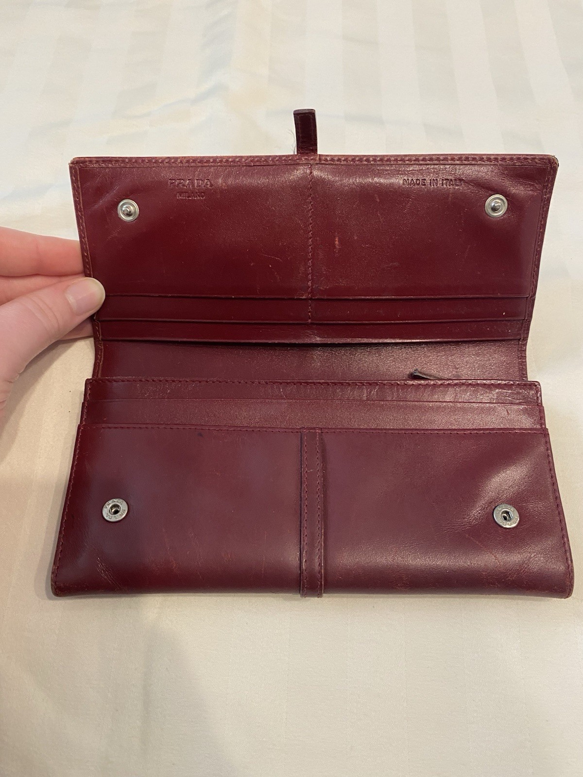 The Rare Prada Bordeaux Bifold Wallet is a luxurious vintage designer accessory for women. Made from maroon/red leather with a solid pattern, this wallet features button closures, embroidered accents, and the iconic Prada logo. Crafted in Italy, this wallet includes credit card slots, a checkbook holder, and a folding design, offering both style and functionality. With its timeless appeal and high-quality materials, this wallet is a must-have for any fashion-forward individual looking to add a touch of sophistication to their collection. Preowned- good condition (especially considering the age of this piece). See photos for pictures of wear/condition. Scratching to leather noted to outside/inside of wallet. Slight wear on the edges. Bolt Luxury sold this same wallet for $295 in similar condition. This is a one of a kind piece- no other listings of this gorgeous wallet currently on ebay! Comes with certificate of authenticity from Official Authentication. Button closure.