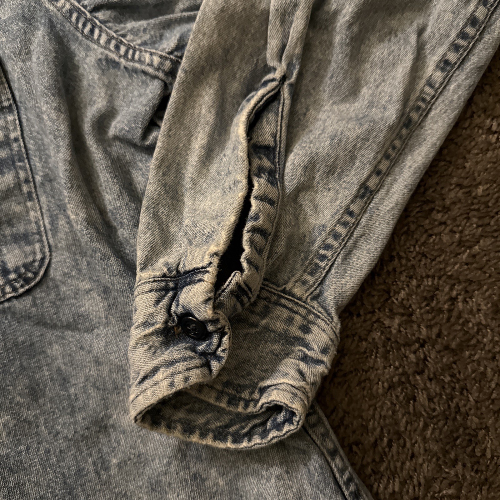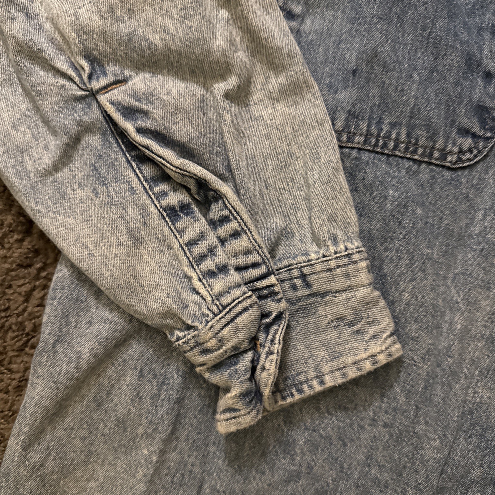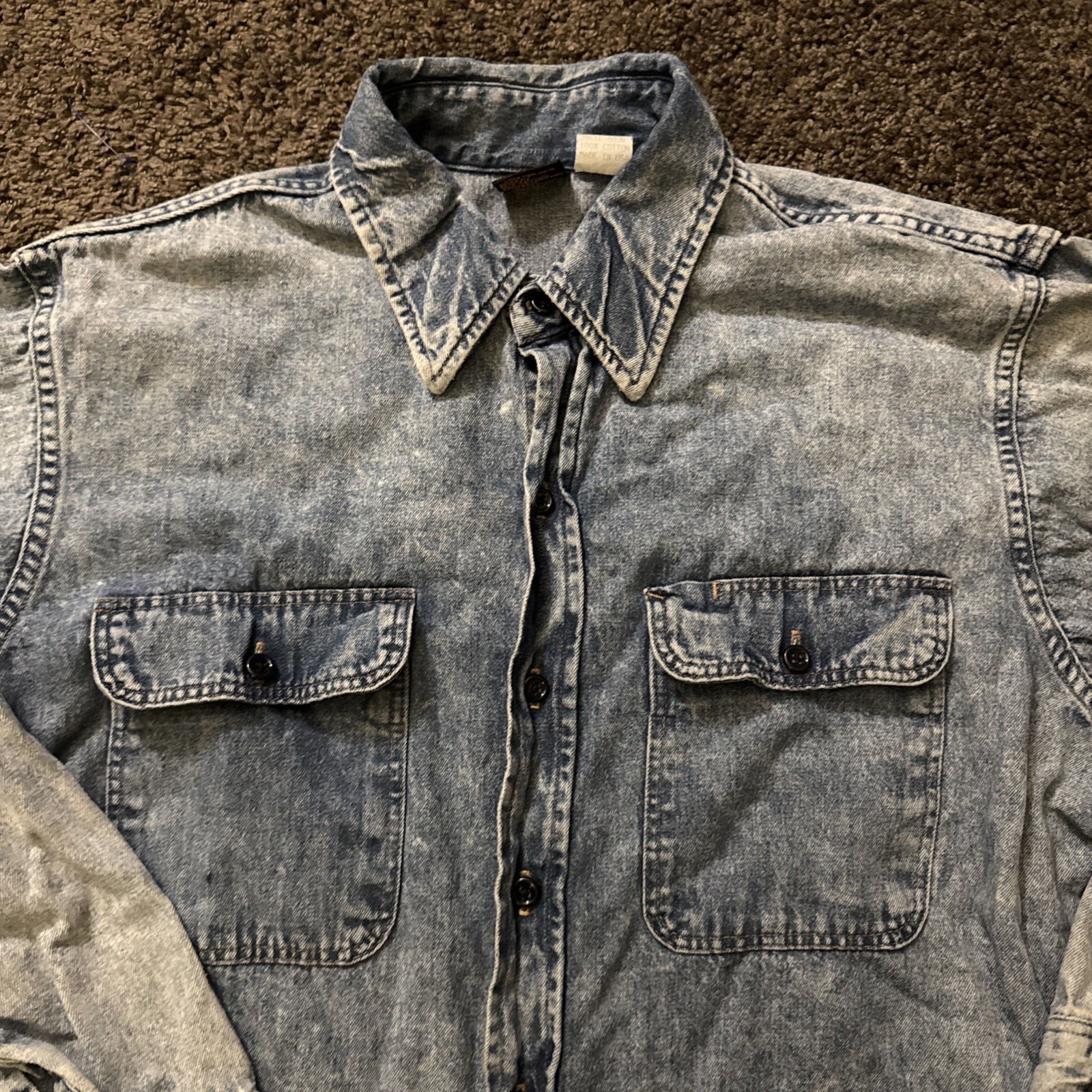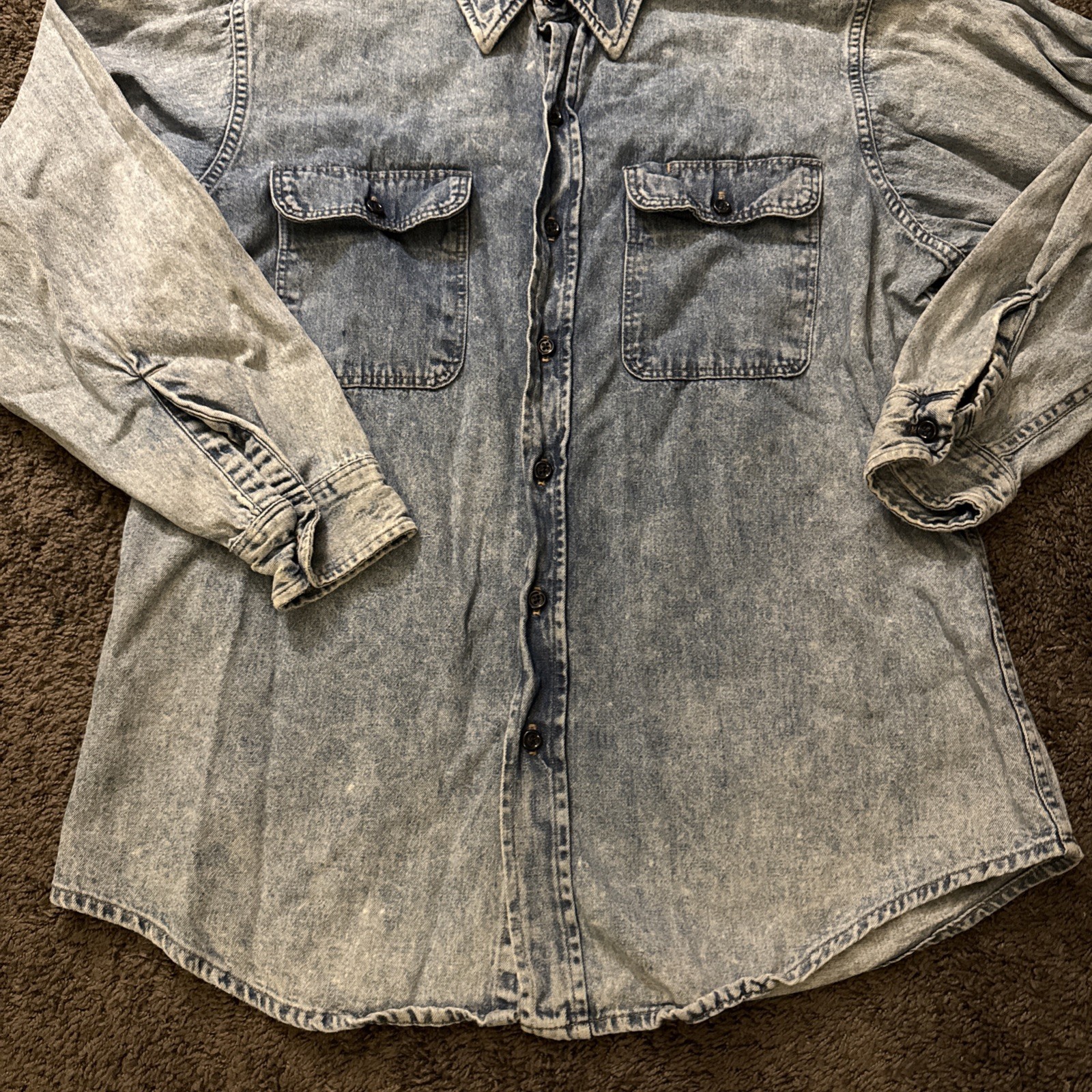 The Vintage Prentiss USA Denim Button Up Long Sleeve Shirt is a classic piece of men's clothing with a solid blue color and a collared neckline. Made from cotton denim fabric, this button-up shirt features a snap closure and a regular fit, perfect for a casual western-style look. The size large men's shirt is a timeless addition to any wardrobe, showcasing the quality craftsmanship and vintage charm of the Prentiss brand.