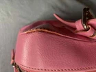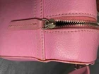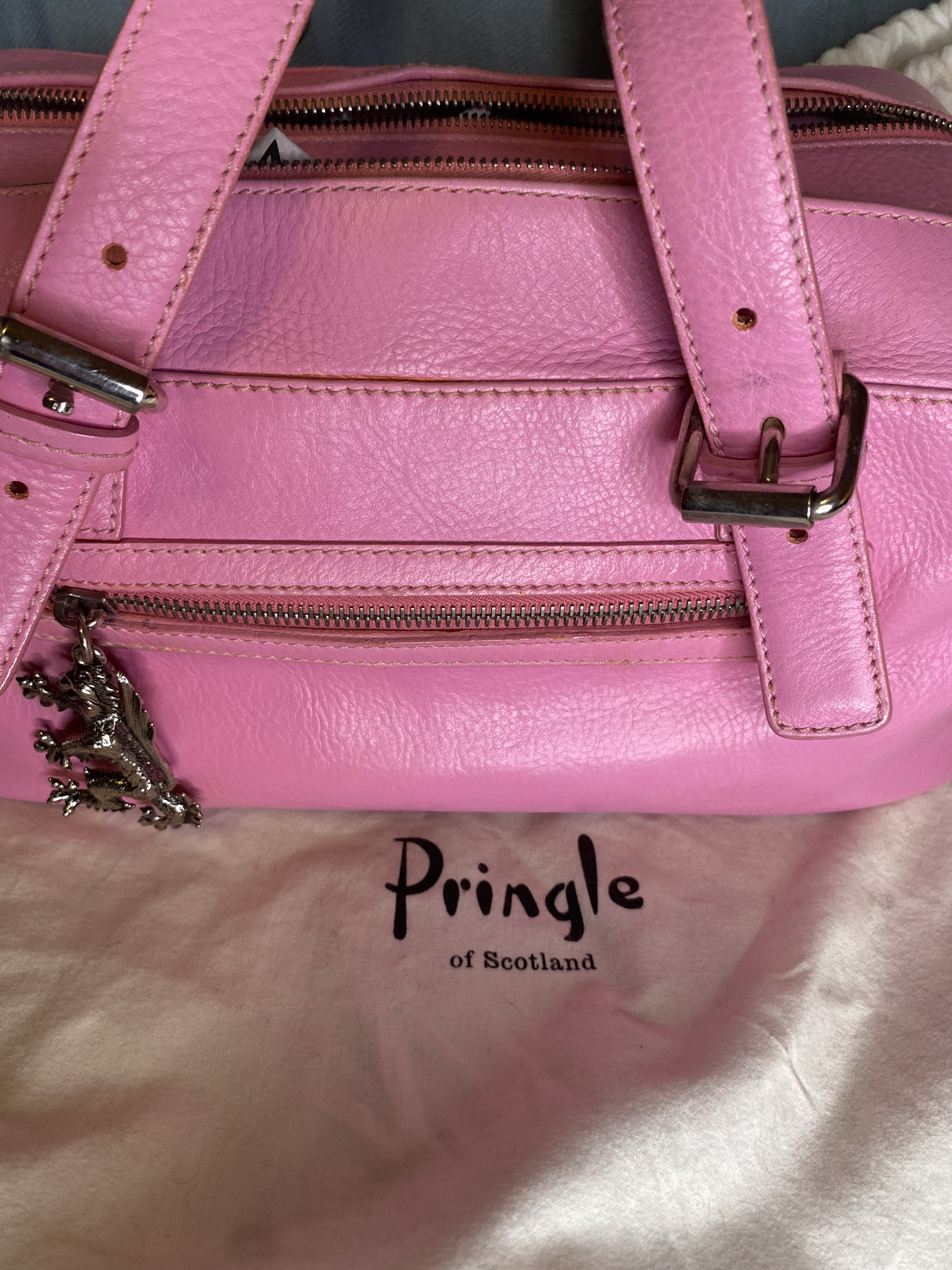 Bright pink Pringle of Scotland satchel. Purchased in London during summer 2007. Used for a season, stored in its protective drawstring bag which is included with purchase. Pink leather shows some wear spots (pictured). Silver zippers with rampant lion detail on front pocket. Measures about 30x20x18 cm or 12x8x7 inches. Cloth lining is also pink. Leather zipper pulls for top zippers. Inner pocket with zipper. All zippers functional. Apart from some minor discoloration, which is expected given the color of the leather, there are no defects, tears, or wear with stitching or lining.