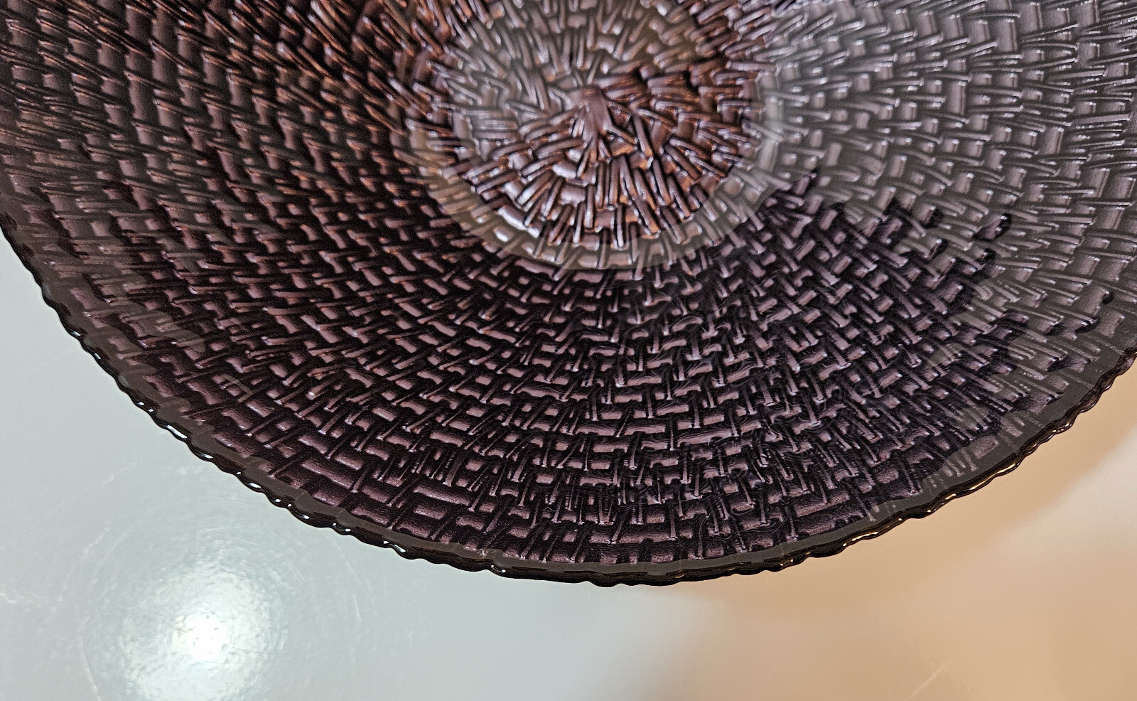 Elevate your dining experience with this vintage glass salad bowl, showcasing a classic basket-weave pattern that adds a touch of elegance to any table setting. The rich purple hue complements a variety of decor themes and enhances the visual appeal of your culinary creations. Measuring at 11 1/4 inches in diameter and standing 3 1/2 inches tall, this bowl is perfect for serving salads, fruits, or even as a statement piece in a display cabinet.Crafted from durable glass, this unmarked bowl is a testament to timeless design and functionality. To maintain its vintage charm, hand washing is recommended for thorough cleaning.