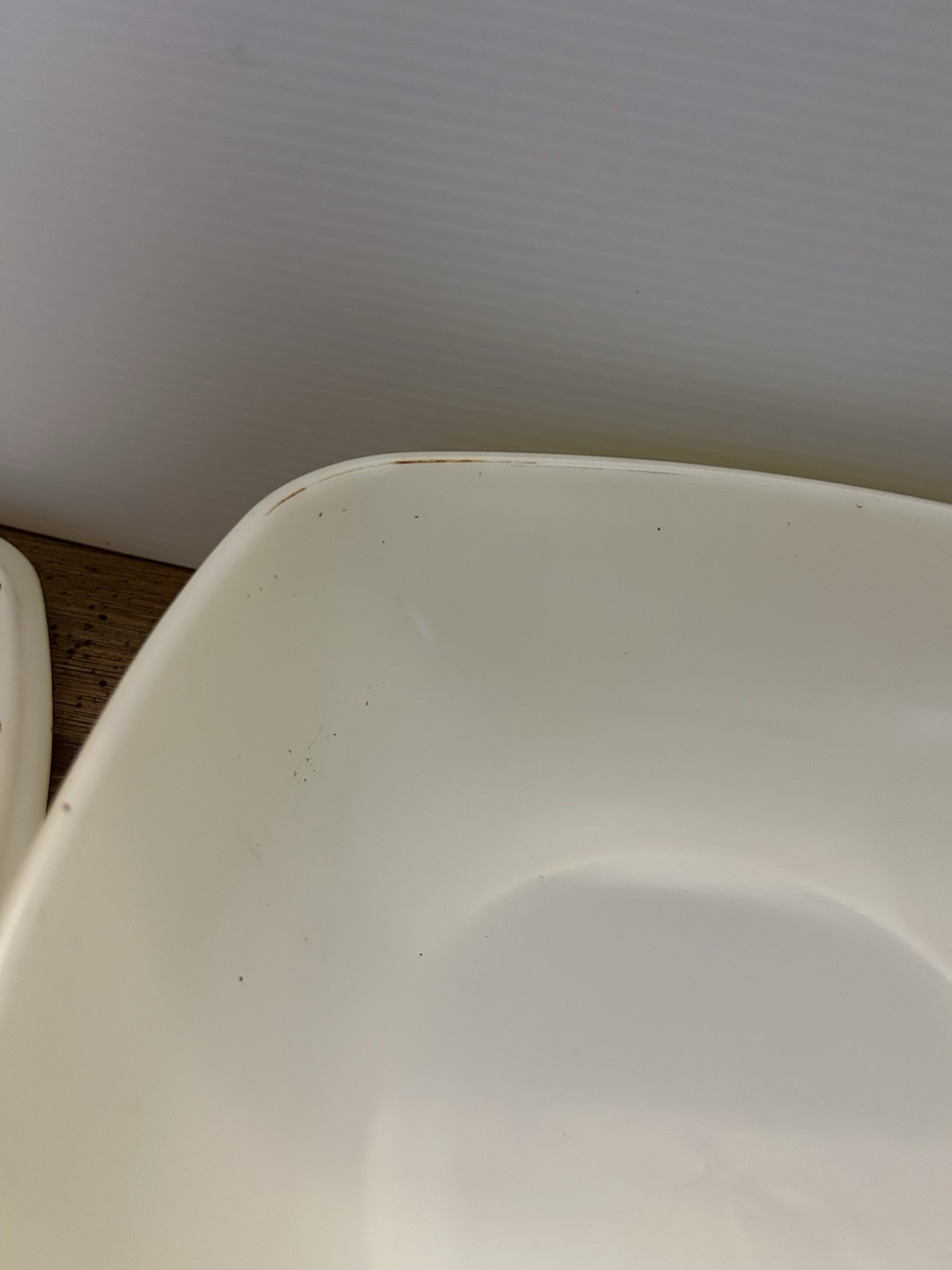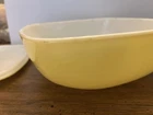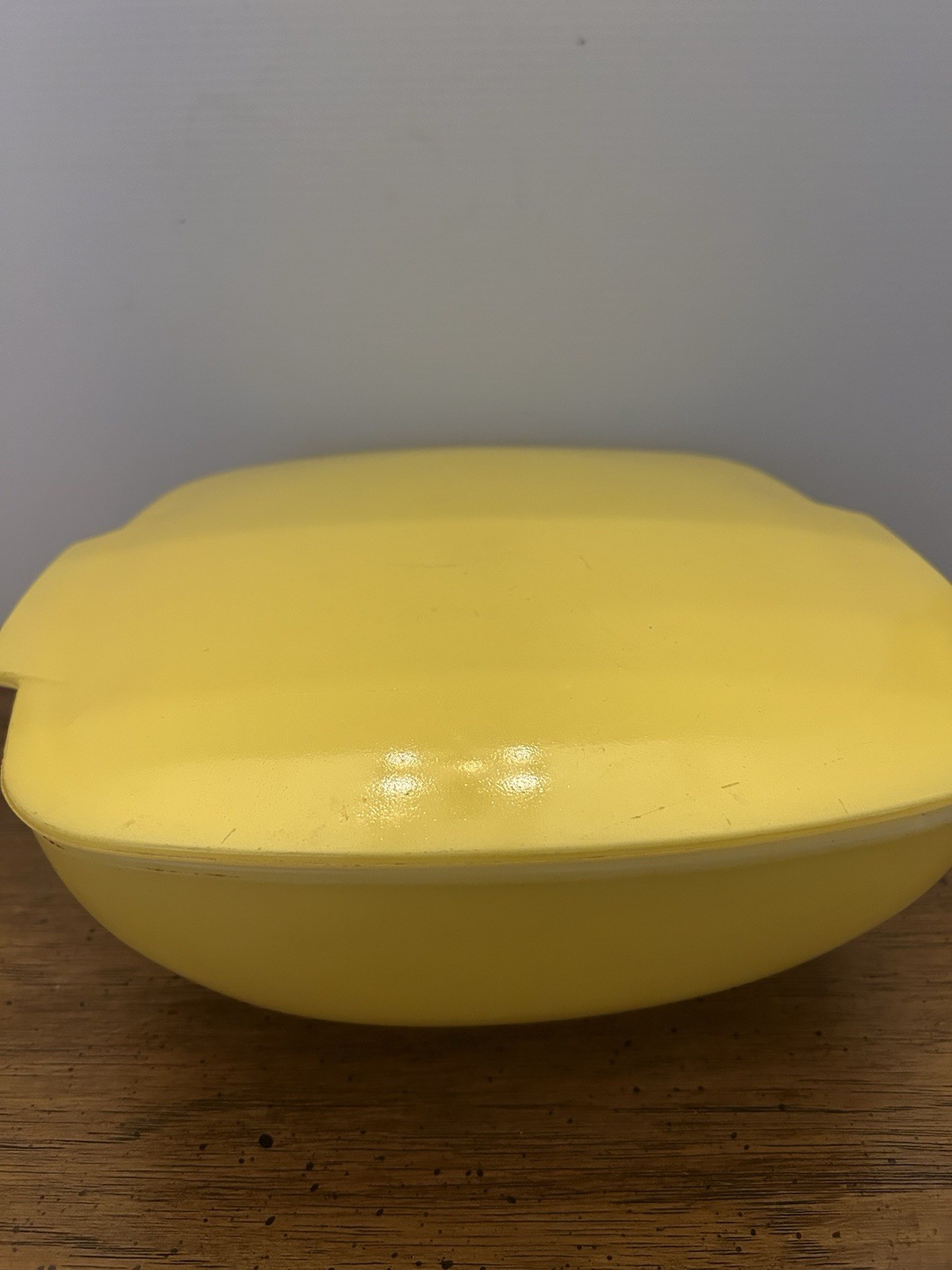 This Vintage Pyrex Yellow Square Hostess Serving Bowl is a 2.5 QT casserole with a lid, featuring a solid yellow color and a retro square shape. Made in America in the mid-20th century, this original PYREX bowl is oven-safe and crafted from milk glass using a fused glass production technique. Perfect for all occasions, this vintage piece stands at 3.5" with the lid included and 9" in width, making it a stylish and practical addition to any kitchen collection.