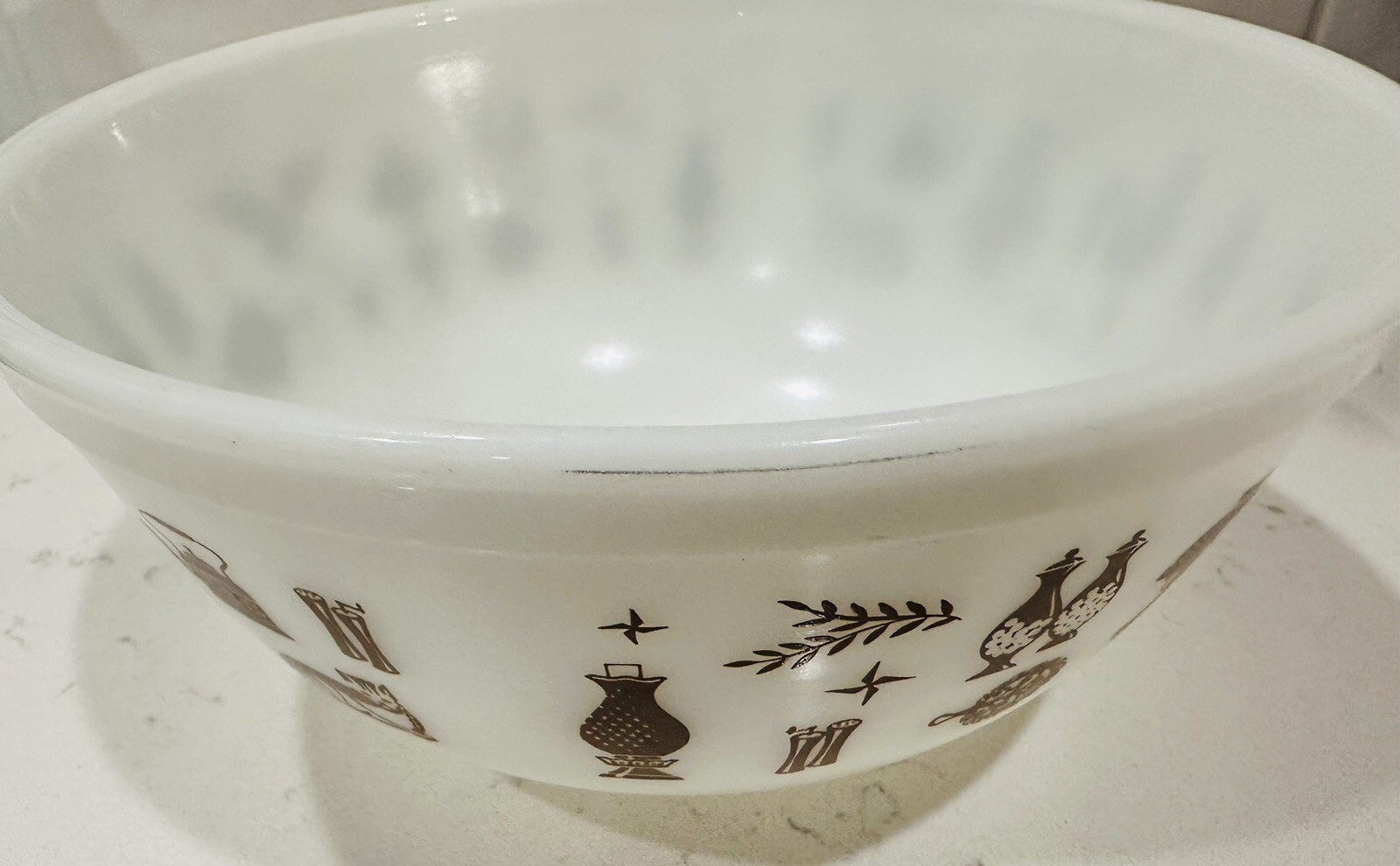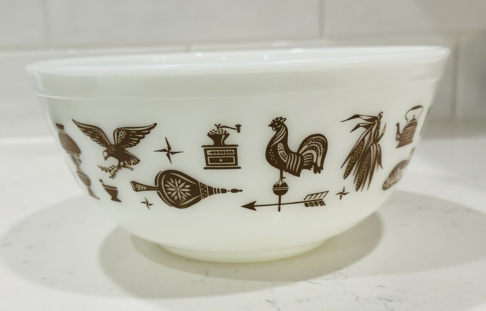 This Vintage Pyrex bowl is a fantastic find! The Early American design in brown and white looks charming, and it's in excellent condition—just a few minor scuffs on the rim, barely noticeable. The exterior is flawless, and it feels sturdy like classic Pyrex should. Perfect for mixing, serving, or displaying. The photos accurately show its condition, so you know exactly what you're getting. A great addition to any kitchen or collection!