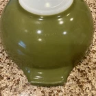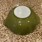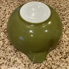 Discover the charm of a classic kitchen with the VINTAGE PYREX CINDERELLA 443 Verde Green Mixing Bowl, a true gem for collectors and home chefs alike. Crafted from durable glass, this round bowl boasts a vibrant green hue that adds a pop of color to any countertop. Its 2 1/2 quart size is perfect for a variety of mixing tasks, from whisking up a quick vinaigrette to serving fresh fruit. With its nostalgic design, this PYREX mixing bowl echoes the simplicity and elegance of a bygone era. Ideal for those who appreciate the beauty of vintage kitchenware, it blends functionality with a touch of whimsy, making it a versatile addition to any kitchen collection. Whether used for its intended purpose or as a decorative piece, it brings a hint of nostalgia to your home. This bowl is 11 inches from handle to handle. It is 4 inches high. No staining on the inside, no chips or cracks. There is some minor paint wear on the outside and on the handles, it is all reflected in the pictures. Very good condition. Pretty shade of green!