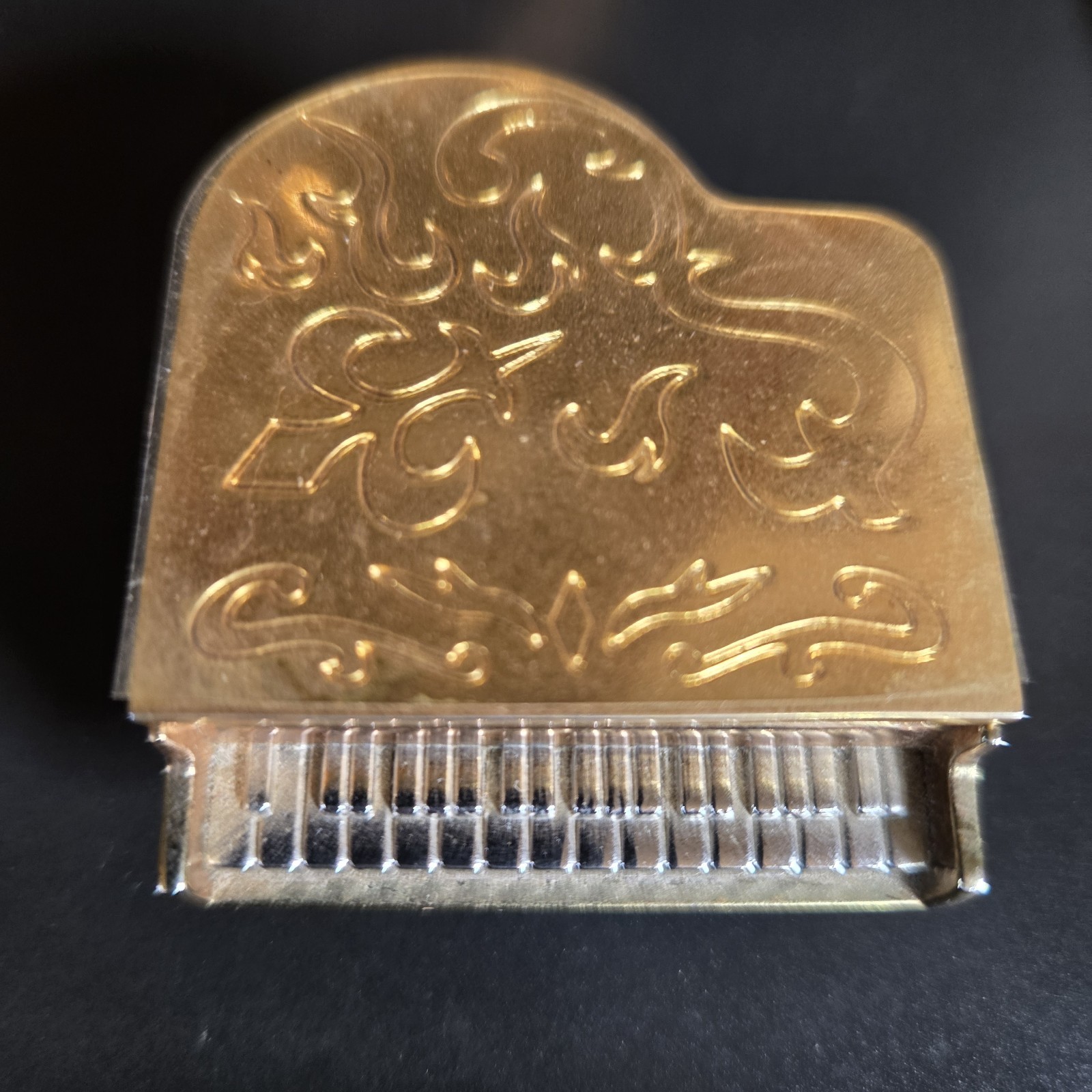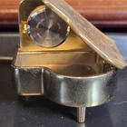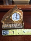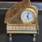 NOTE: NEEDS BATTERY This Vintage Quartz Mini Clock in Gold Tone Metal is a charming addition to any desk or piano. Powered by battery, this analog clock from the late 20th century features a unique piano and clock face design. The face shows " Do Re Mi Fa So La Ti Do" in place of numbers. Reminiscent of The Sound of Music and Julie Andrew's!