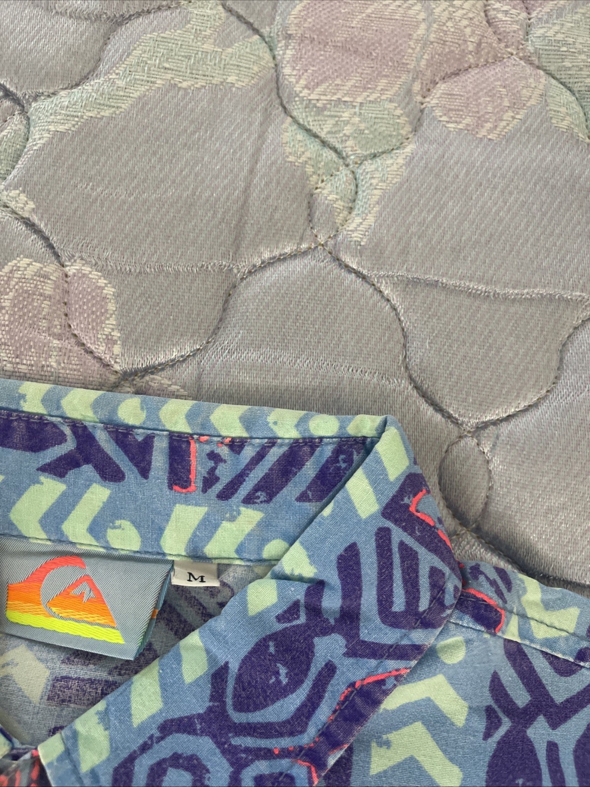 The Vintage Quiksilver Abstract Geometric Print Button-Up Shirt is a nostalgic piece from the 90s surf style era. Made of comfortable cotton material, this shirt features a collared neckline, short sleeves, and a button-up closure for a classic look. The multicolor geometric print adds a unique touch, perfect for casual occasions in the summer and spring seasons. With a regular fit and pockets for added convenience, this vintage Quiksilver shirt in size M is a stylish and versatile addition to any man's wardrobe.