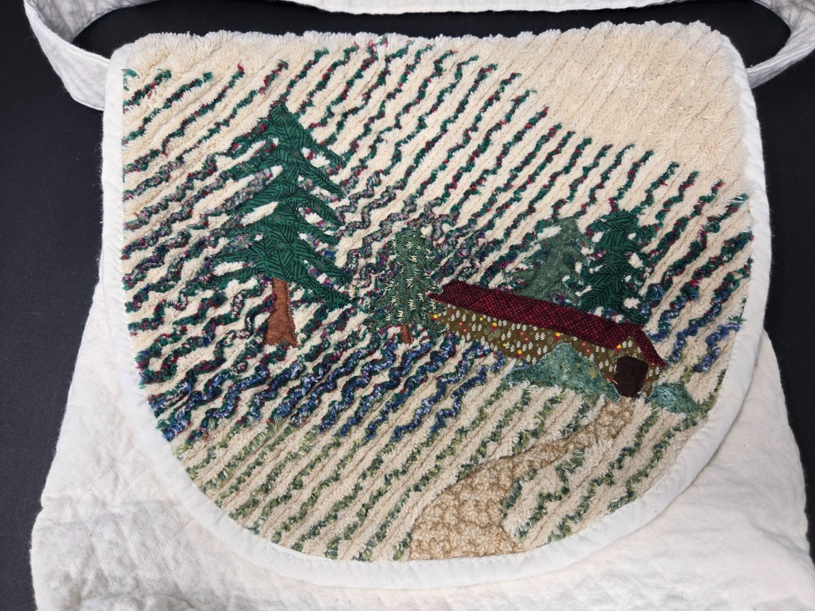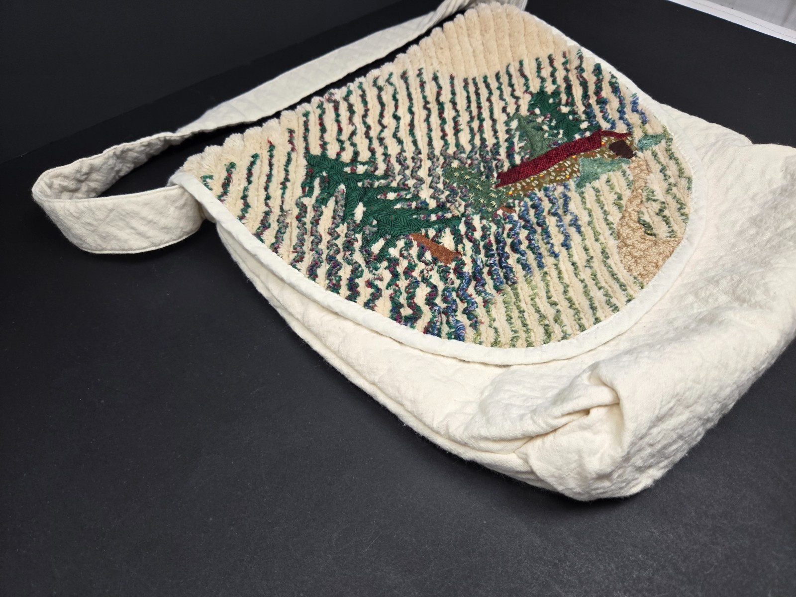 This Vintage Quilted Satchel Handbag Purse is a unique and handmade piece that exudes a hippie BOHO style. The handbag features a winter scene pattern with applique accents, perfect for the Christmas theme. Made of cotton with a quilted finish, this medium-sized bag has a rectangular shape and a flap-over closure. The ivory top handle adds a touch of elegance, while the multicolor lining and inner pockets provide functionality. Perfect for travel, parties, casual outings, or workwear, this satchel/top handle bag is a vintage treasure that is both stylish and practical. All of our items are shipped from a SMOKE-FREE environment.