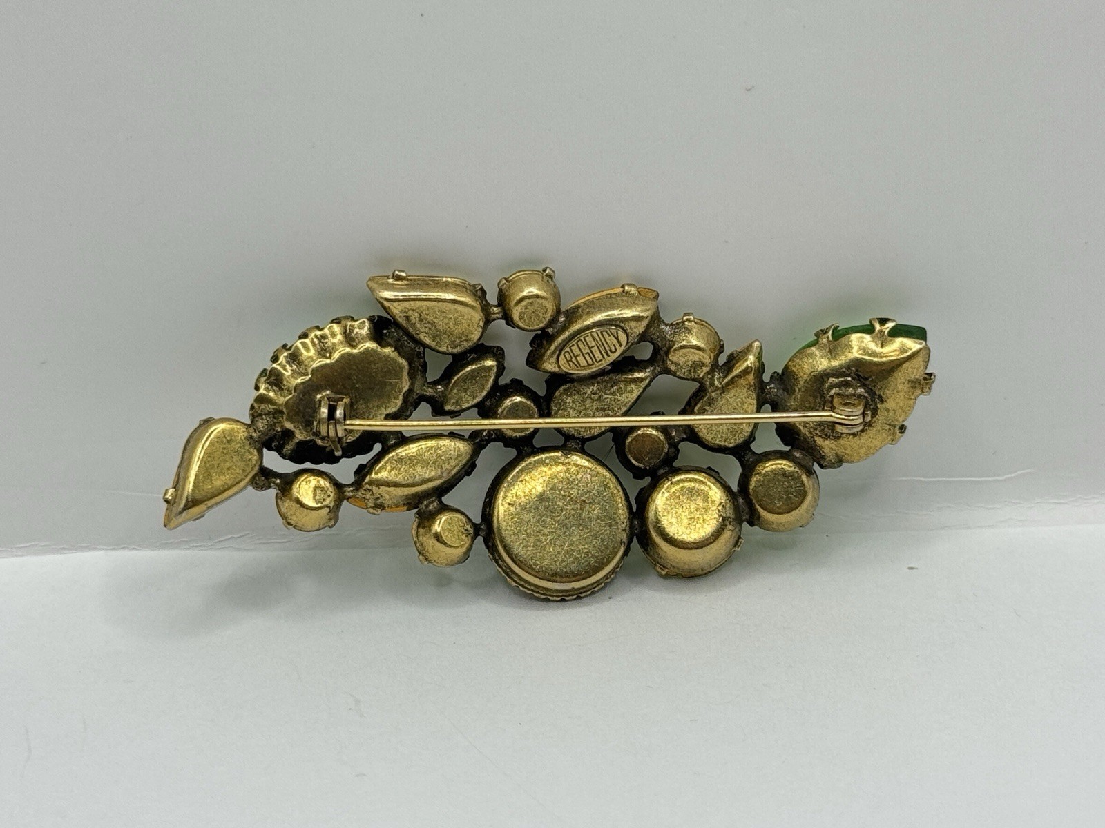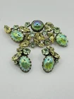 This Vintage Regency Large Cat Eye Art Green Color Glass Brooch Pin & Earrings Set is a beautiful and unique jewelry set perfect for various occasions like Mother's Day, graduation, anniversaries, birthdays, and more. The set includes a brooch pin and earrings, both featuring a figural shape with a green glass main stone and crystal secondary stones. The vintage design from the Retro era (1935-1950) exudes beauty and artistry, making it a standout accessory for women who appreciate timeless elegance. The set is signed by the brand Regency and was made in the United States, adding a touch of authenticity and quality to this original piece.