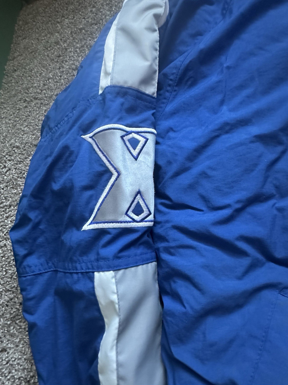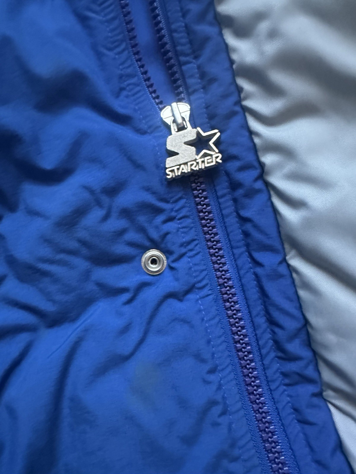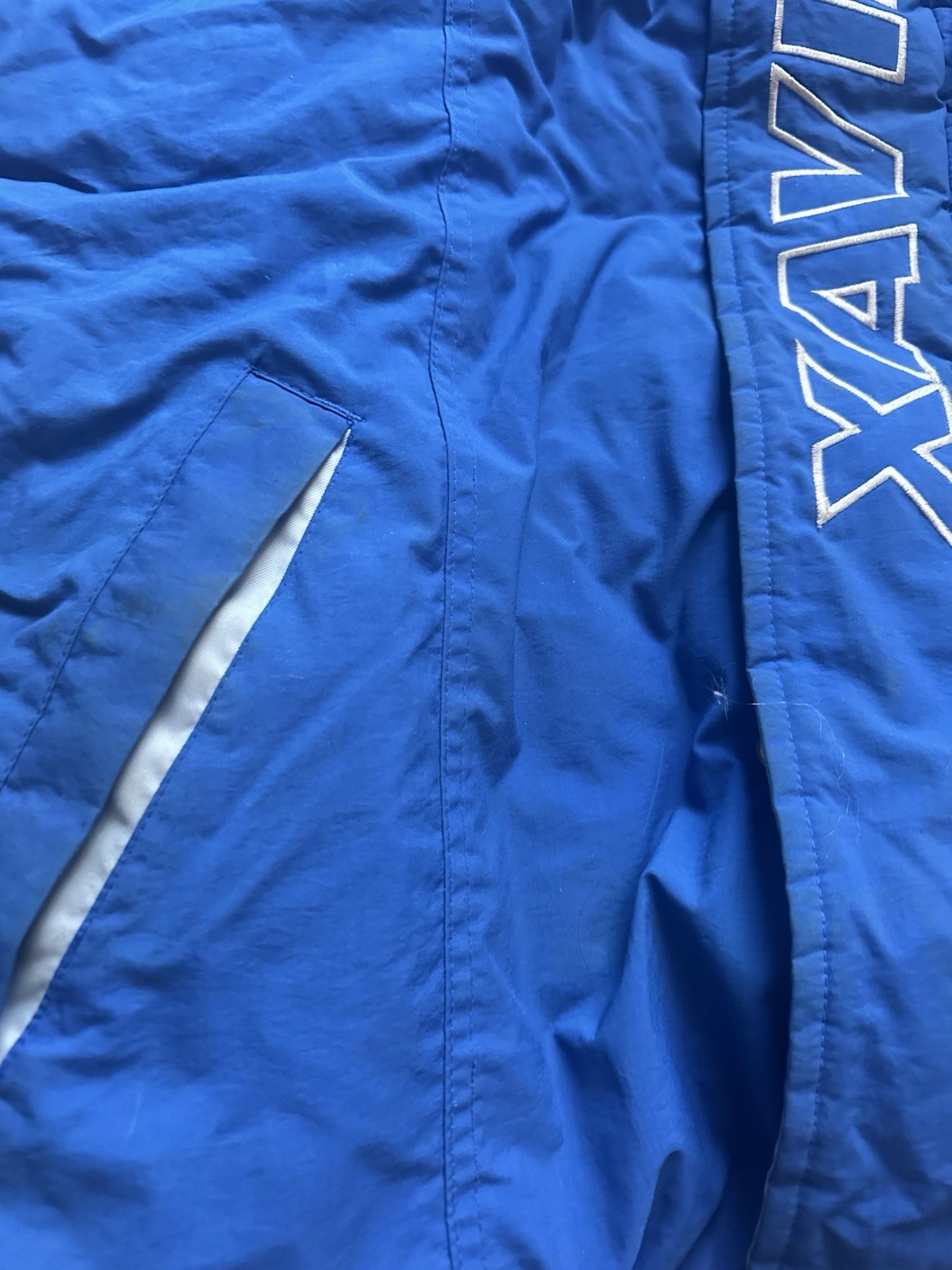 In used condition. Has a lot of staining and dirty spots on it. The collar is very stained. It has a light odor. Please see pictures.