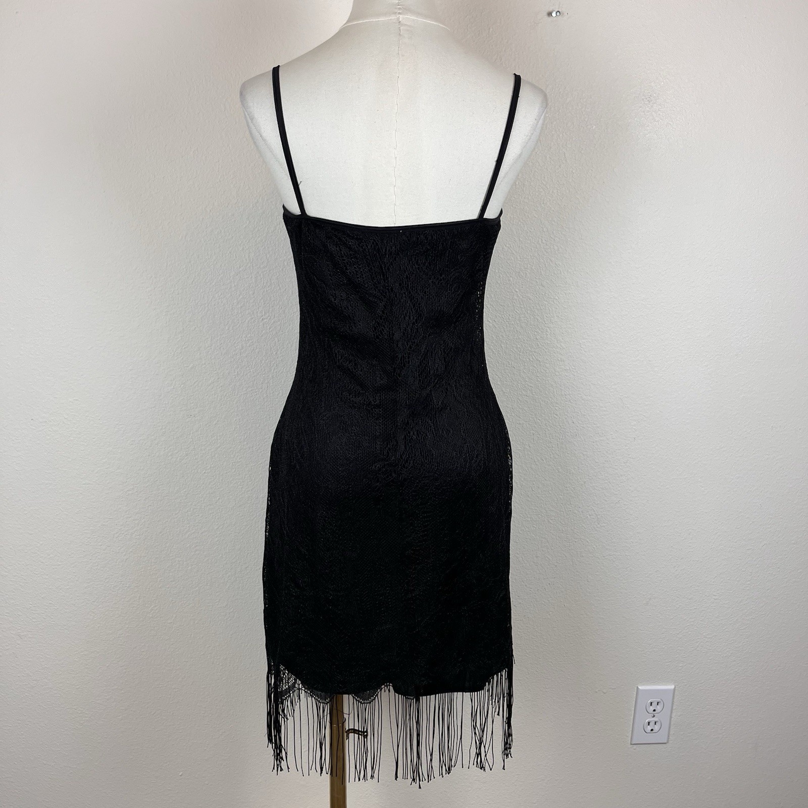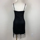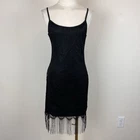 Vintage Rave City Womens Dress Polyester Lined Lace overlay Fringe hem Strappy Bodycon Scoop neckline Gothic Party Rave Grunge Retro 90s Y2K Very good preowned condition Measurements in photos Size M