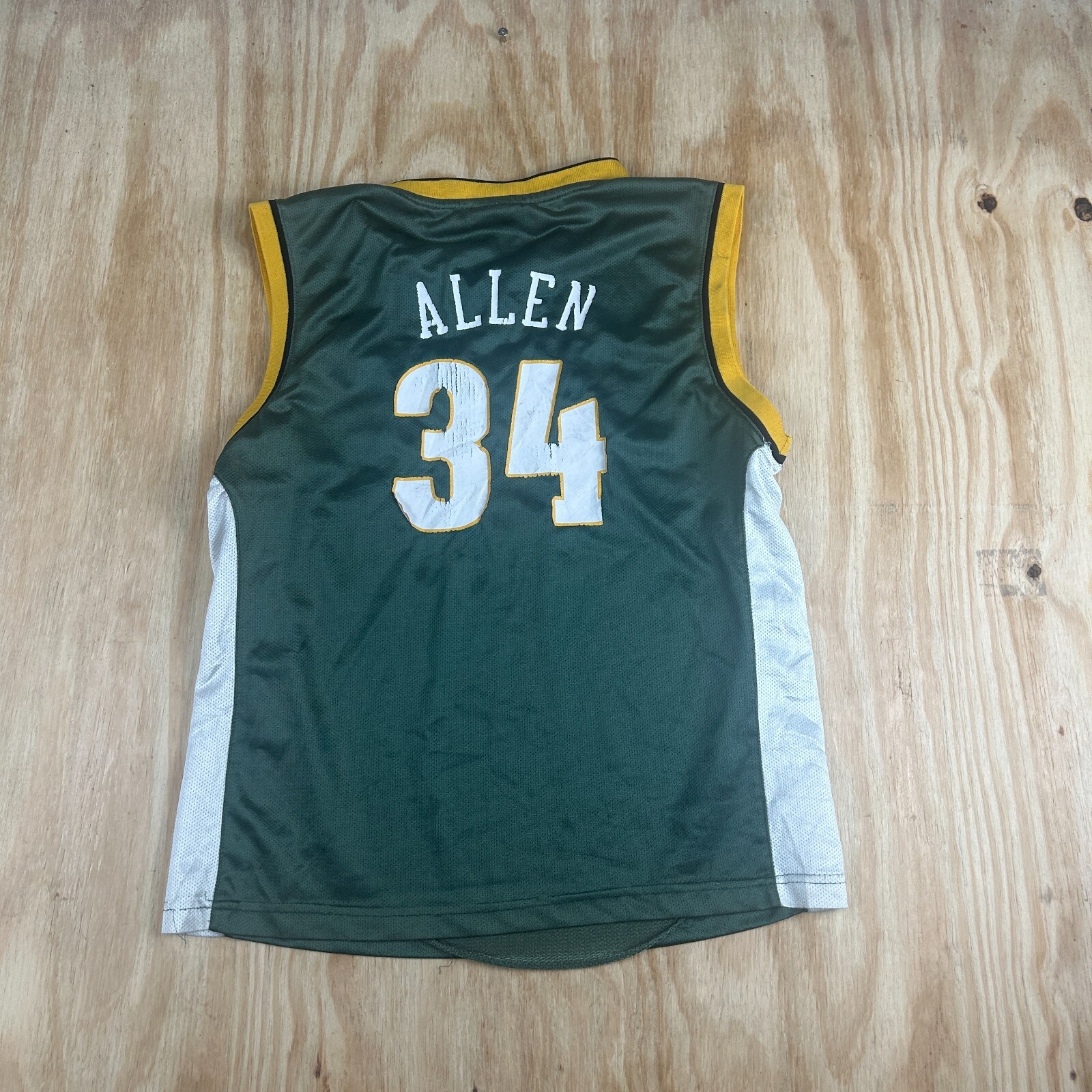 Immerse yourself in the nostalgia of the hardwood floors with this Reebok NBA Seattle Supersonics #34 Ray Allen Jersey. A must-have for any basketball enthusiast, it captures the spirit of the game and celebrates one of the sport's sharpest shooters. Designed for unisex children, this jersey boasts a vibrant green color, reflective of the iconic Supersonics' hues, and is sized large, fitting ages 14-16 with a comfortable capacity of 8 oz. Crafted with attention to detail, this piece hails from the Russian Federation, assuring the quality and craftsmanship that Reebok is known for. It's perfect for wearing during the regular season or for displaying as a cherished collector's item. Whether you're hitting the court or the streets, this jersey is a timeless tribute to the legendary Ray Allen and the storied legacy of the Seattle Supersonics.