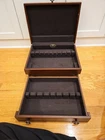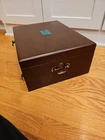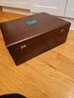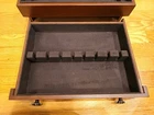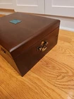 Reed & Barton Wooden Silverware case with a drawer. Very nice condition. Some scratches from use. A few tiny dents in the wood on the cover. Name plate on cover has never been etched and still has the protective plastic. Great side and drawer handles. Clean inside. Measures 14 3/4"" long x 6" high x 11 1/4" wide. A great redish brown wood.(maybe cherry, but not sure). Made by eureka mfg. Holds a service for 12. 12 knife slots on the cover.