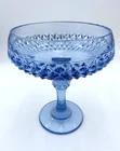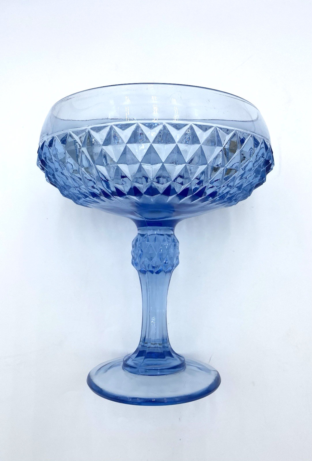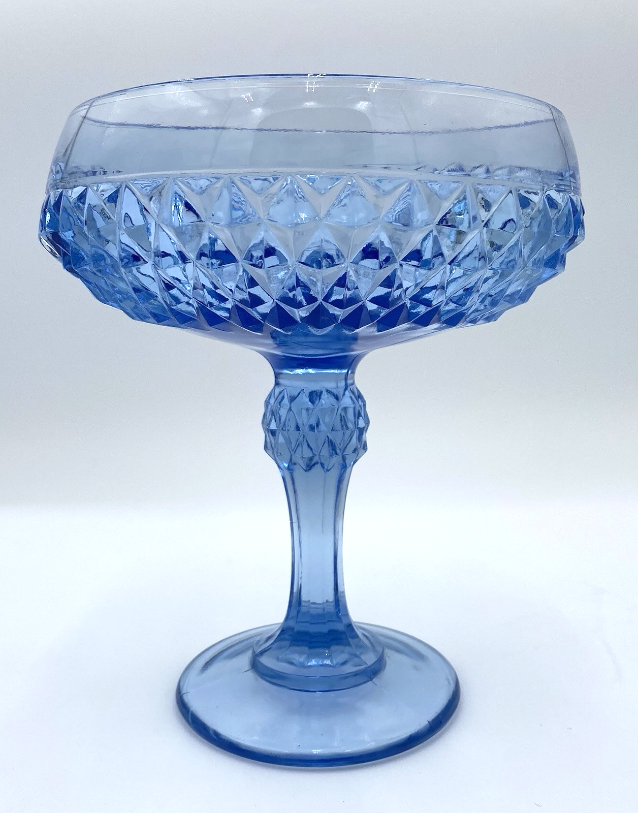 Elevate your home decor with this vintage Indiana Glass Diamond Point Compote, a piece that exudes timeless elegance. Crafted in the 1970s, the compote boasts their regal blue hue, complemented by the intricate diamond point pattern, adding a touch of sophistication to any room. The glossy finish enhances the visual appeal of this press glass masterpiece, originally produced in Dunkirk, Indiana. Ideal for all occasions, this compote stands at 7.3 inches tall with a round diameter of 5.7 inches, making it a substantial yet versatile addition to your collection. It's a original piece from the Regal Blue Diamond Point Glass line, reflecting the heavy, deep design characteristic of this line. Whether used as a centerpiece or a standalone display item, this compote is sure to captivate and add a vintage flair to your space. The compote is in excellent used condition. There are no chips or cracks. There are a few light surface scratches on one area of the outside rim (see picture 7).