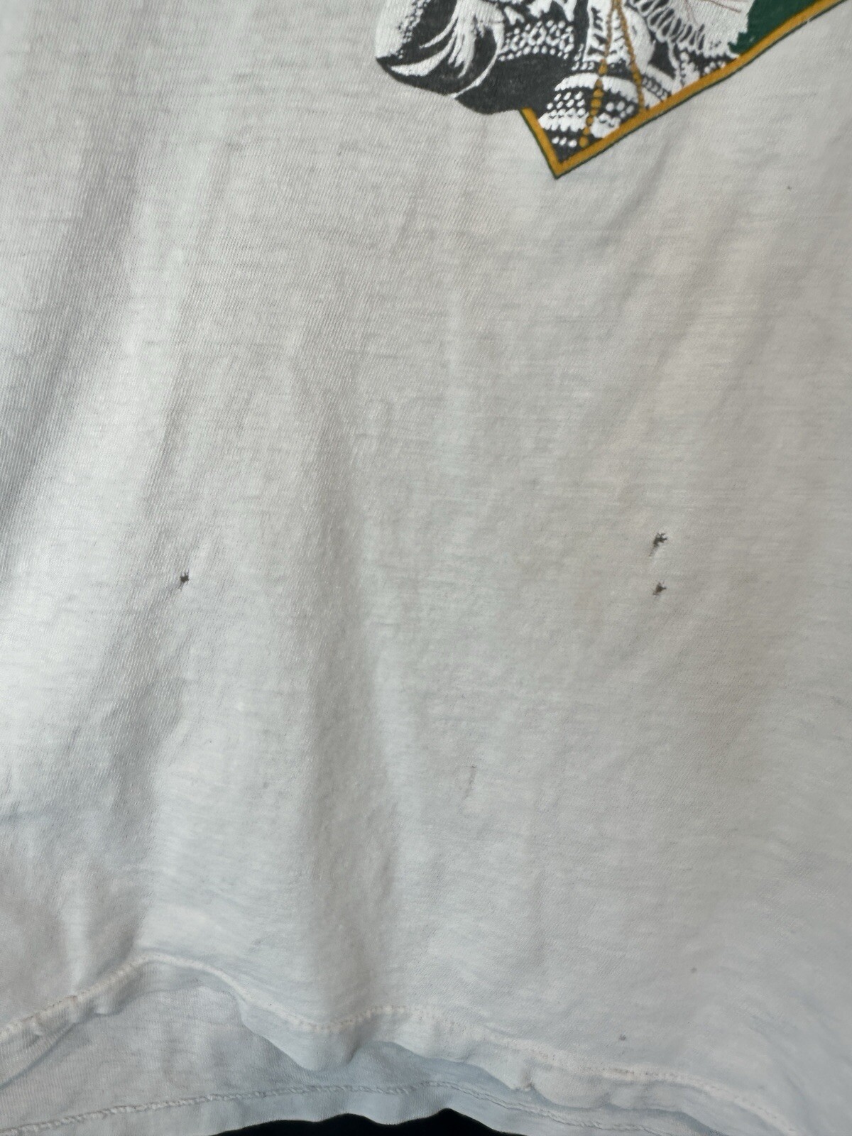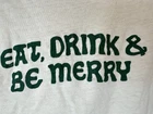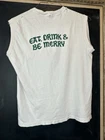 This XL vintage Hanes Renaissance Pleasure Faire in California, showcasing a Beer Wench character. The sleeveless shirt is made of cotton with a crew neckline, single stitch fabric, and a white color. It is machine washable and features a regular fit. There are some holes around the neckline and of the bottom front of shirt but overall shirt and graphic are in very good condition. Features the words, "Eat, Drink & Be Merry" on the back. Measurements are appoximate: Chest: 18" Neck to bottom hem: 23" Sleeve: 0" Shoulder: 16"