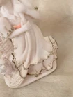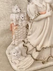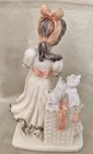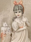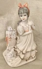 Sweet little girl is sweeping and has 3 pups looking after her. This is an ivory color, resin figurine. She has antique gold trim on her dress with pinkish accents. Her dress also has an eyelet appearance. Green felt on the bottom. Minor vintage wear. Measures approx 5”H and 3” W. Cute.