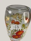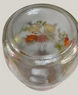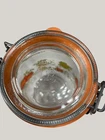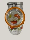 Vintage Arcoroc canister set from the 1970s, featuring a set of 4 glass jars with a multicolor vegtable pattern including mushrooms, tomatoes, and garlic. The jars have a clasp lock lid and come in a cylindrical shape. Each jar is sized 6.75", 8.75" x 2 and 9.75” tall, and 4.5" wide. Made in France, this retro set is ideal for kitchen storage and organization with a vintage appeal. One is missing the rubber seal. One’s rubber seal is cracking and would need to be replaced. The one without a seal has scratches on the outside of the jar at the top where it looks like the metal may have scratched it over time. The lid on the largest jar is damaged slightly, but no sharp edges. They are 1 Liter, 1.5 Liters x 2 and 2 liters in capacity.