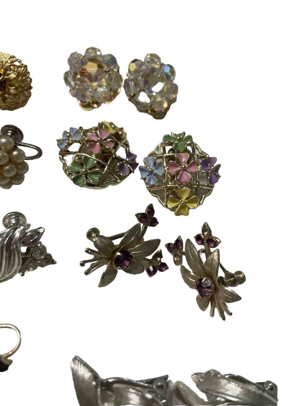 This vintage jewelry lot includes a beautiful pair of clip-on earrings with a floral design featuring rhinestones, enamel, and pearls. The earrings have a screw-back closure and are made of metal, ensuring they are durable and long-lasting. These earrings are a great addition to any vintage jewelry collection and are sure to make a statement. The earrings were made in usa/Japan and are original, one-of-a-kind pieces. They are perfect for those who love vintage and antique jewelry, and their unique design makes them a great conversation starter. Add these earrings to your collection today and enjoy the timeless beauty they bring. One marked Marvella