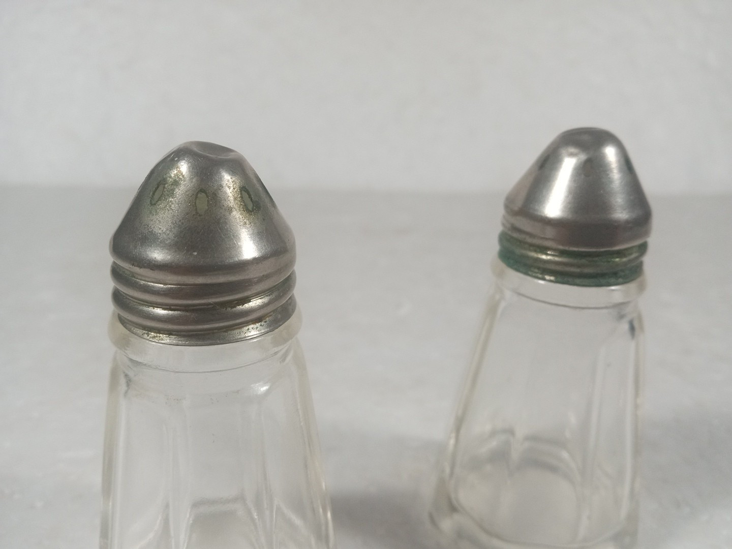 This vintage set of ribbed glass salt and pepper shakers features round containers with a clear color and metal lids that show signs of corrosion. The shakers are from the 1950s and are designed in a ribbed glass style, each measuring 3 inches height. The set includes both a pepper shaker and a salt shaker, making them a classic and functional addition to any kitchen or collection.