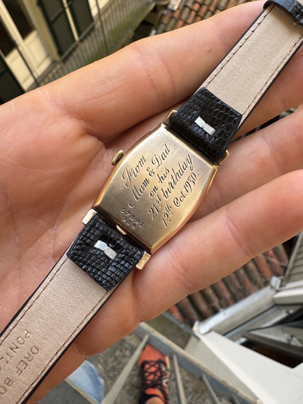PROPONIAMO; -Marca: ROLEX PRIMA (ART DECO') -Cassa: ORO GIALLO DA 25X40 LUG TO LUG -Movimento :ORIGINALE CARICA MANUALE , COEVO -Vetro:PLEXY -Corona:ORIGINALE A SCATTO -Ghiera: LISCIA -Tasti: NO -Quadrante:BIANCO , NUMERI ARABI SMALTO NERO -Lancette: ACCIAIO AZZURATO -Cinturino/Bracciale: LUCERTOLA PER ANSE FISSE GENERICO NUOVO -Scatola e documenti: NOSTRA POCHETTE IN VELLUTO COMPRESA -Condizioni : OTTIME -Revisionato:SI -Uomo/donna/unisex:UOMO/UNISEX PER QUALSIASI DUBBIO CONTATTATEMI ,RISPONDEREMO IL PRIMA POSSIBILE
