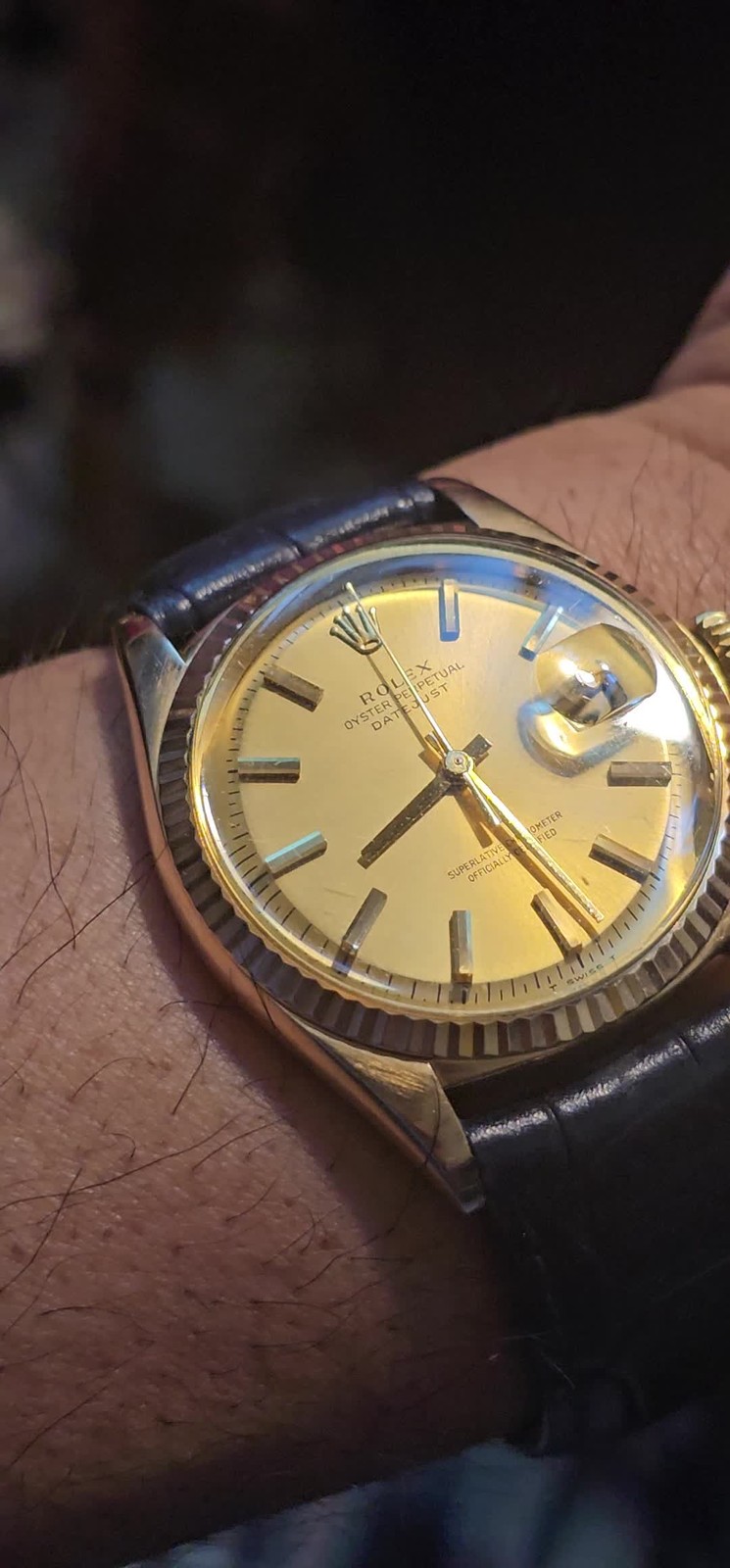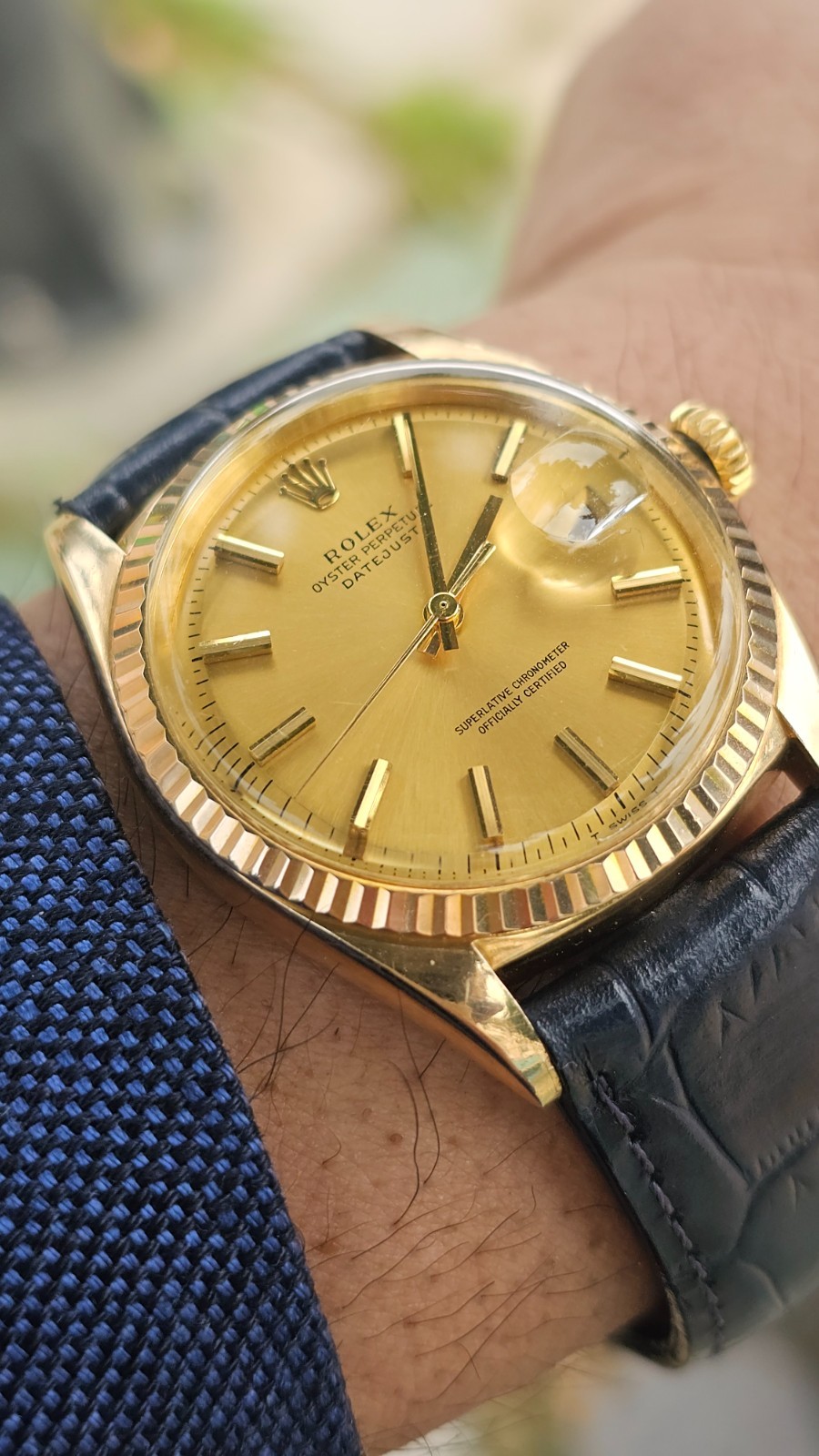 The Vintage Rolex Datejust 1601 CUSTOM Gold Case Men's Automatic Watch is a luxurious timepiece with a 36mm yellow gold case, featuring a fluted bezel and a pie pan dial with baton indexes. This 1970s-era watch boasts a mechanical automatic movement with 26 jewels, making it a reliable and stylish accessory for any modern man. With a two-piece leather strap in blue, this watch comes with a screwback caseback and a date indicator feature, adding to its functionality and appeal. This custom vintage Rolex is a timeless piece with a classic design that is sure to impress. I am so excited to be able to offer you a gorgeous vintage Rolex Oyster Perpetual Datejust CUSTOM Gold Case Ref.1601 men's automatic watch. AFTERMARKET gold case and original Rolex 1570 movement The yellow gold CUSTOM Oyster case, screw down caseback, yellow gold fluted bezel and crystal are all in good condition for its age. The dial is fitted with gold hands & markers and a date window at 3 o'clock position which is a great asset to this vintage. The robust 36mm stainless steel Oyster case with a screw down Rolex crown has remained in good condition with general wear but no significant damage. In fully working order- runs strong and tells good time, powered by a reliable Rolex 1570 movement with 26 jewels. It will come on the generic blue leather strap. You will get exactly what you see. The pictures say it all. Please check all my pictures for more details as they are the best description of the watch much better than I could. I will ship the watch to your door using FedEx International Priority. Expected to arrive in 3~5 days of shipping. No box or papers are included. Please note, the buyers are responsible for import and duty fees. I am so grateful you have visited my E-house, Sir...... Thanks for your attention !!