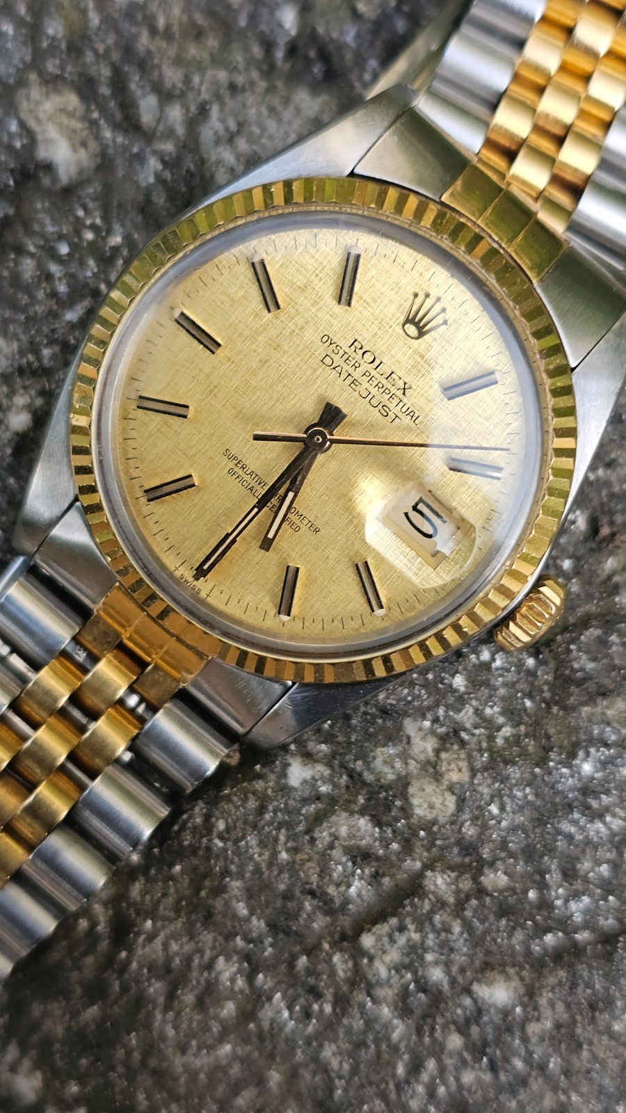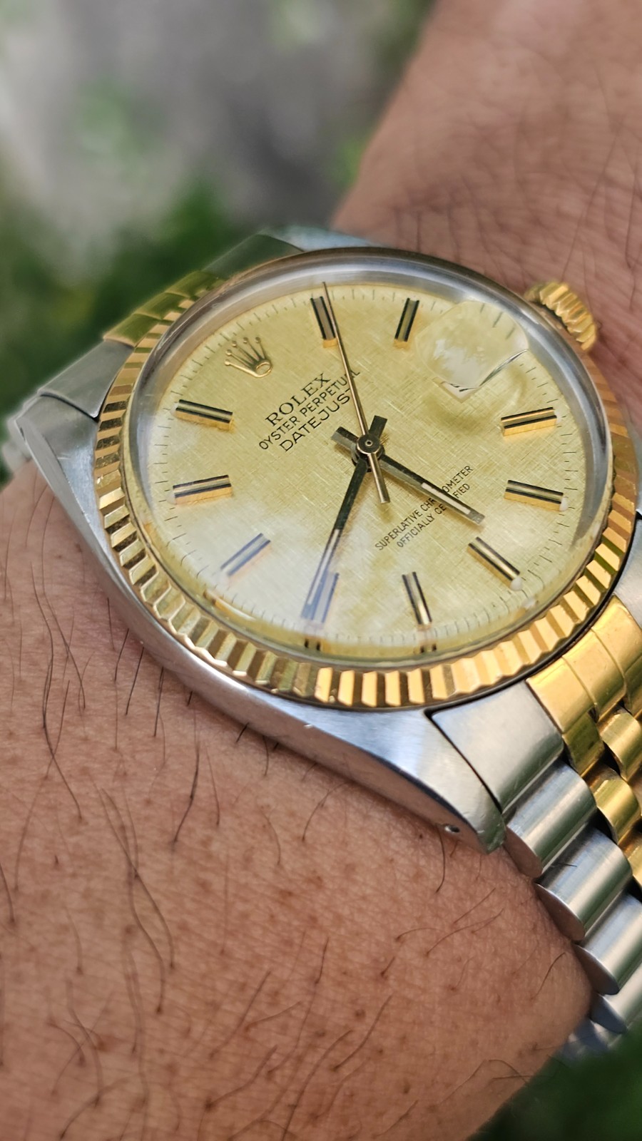 This vintage Rolex Datejust is pure class! The champagne linen dial paired with the gold bezel and stainless steel case gives it a timeless, elegant look. The automatic movement keeps perfect time, and the Jubilee bracelet is super comfortable. A true collector's piece that never goes out of style—perfect for adding a touch of luxury to any outfit.
