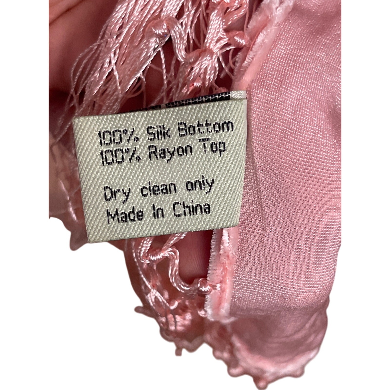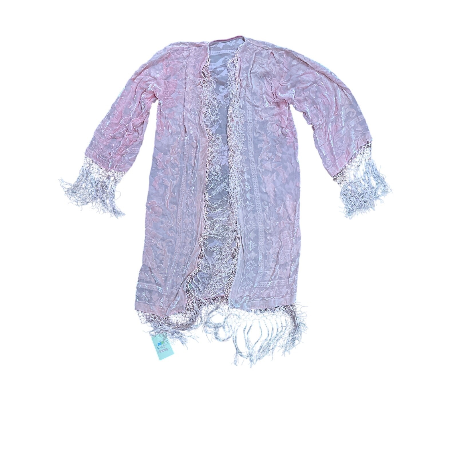 Vintage Rose Burnout Pink Velvet Sheer Silk Rayon Open Front Boho Fringe Kimono - One Size - Approximate Length 39inches without fringe, 47inches with fringe - New with tag - Material: Bottom: 100% Silk, Top: 100% rayon boho, whimiscal, bohemian, Whimsy, Hippie