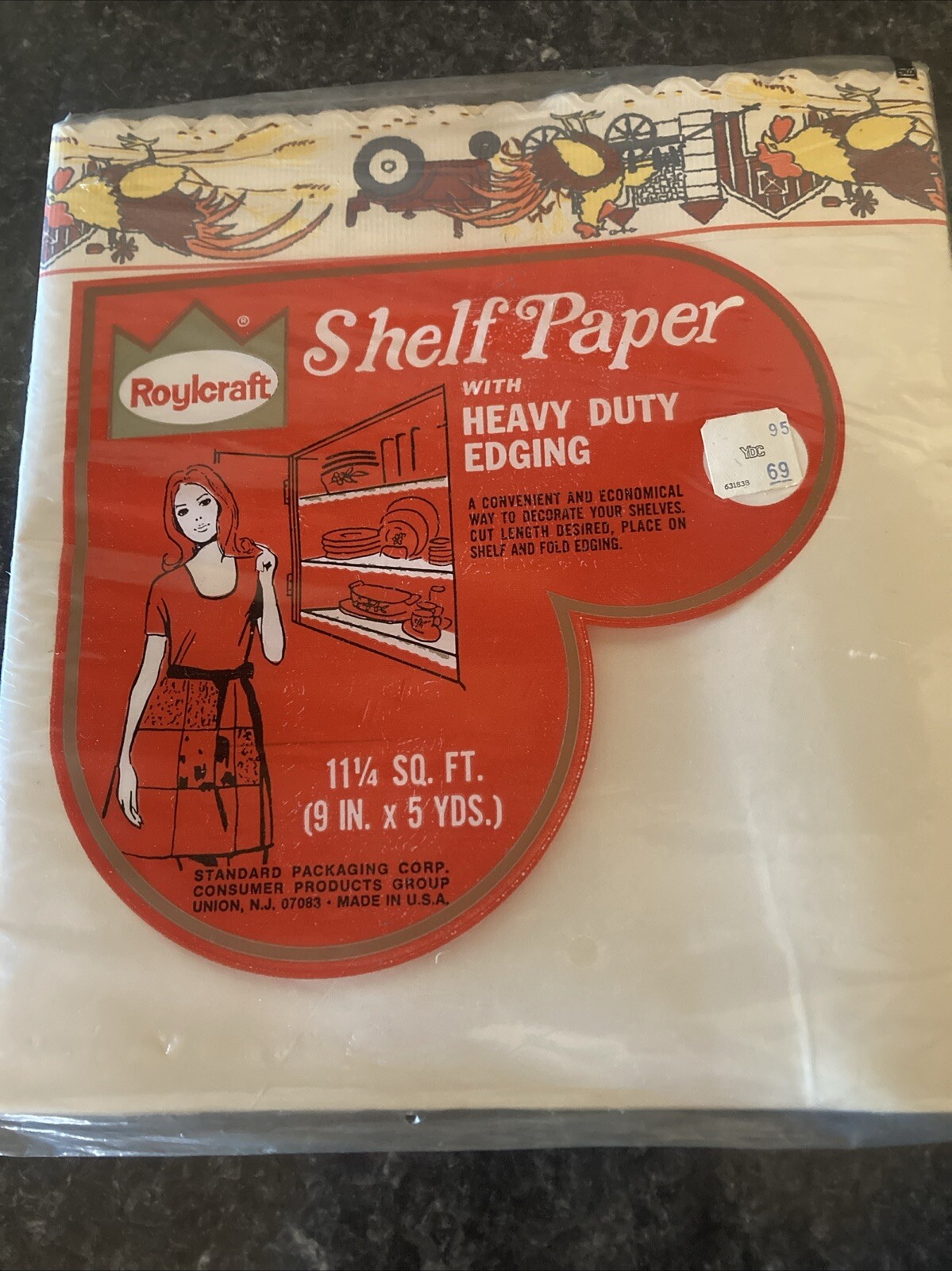 One package is new and sealed The other has been used but still a lot left, does have pencil marking on end where it was cut from pervious use Selling as a New and Used lot Vintage roylcraft shelf paper Features roosters on a farm, tractor and barn in the background See photos 11 1/4 sq ft (9 in x 5 yards) in new package Unknown amount in used package but has a good amount