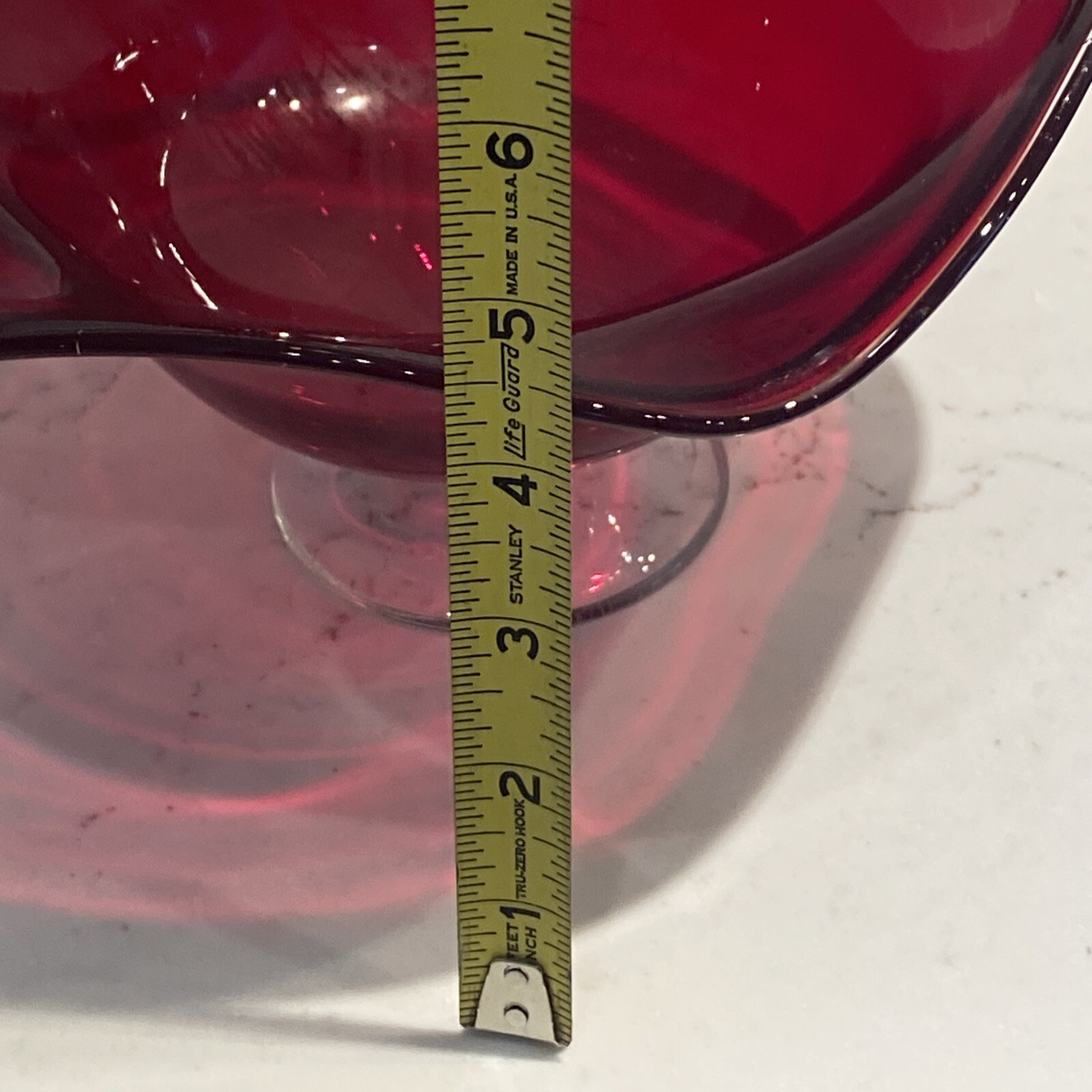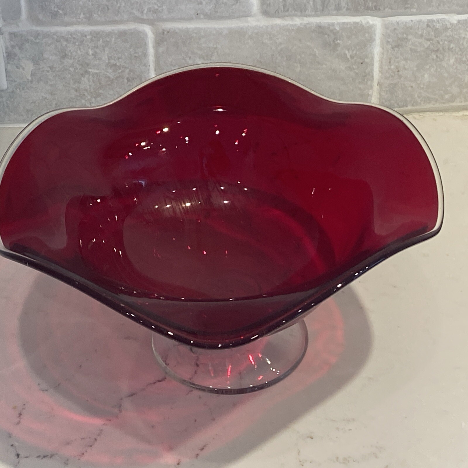 Vintage 9” Ruby red and clear brown glass ruffled pedestal bowl. The trim and pedestal are clear glass. Measurements as per pictures.