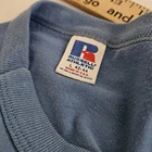 This is an awesome vintage shirt from Russell Athletic. Size large 42 - 44. Faded baby blue with a few minor stains and signs of use.