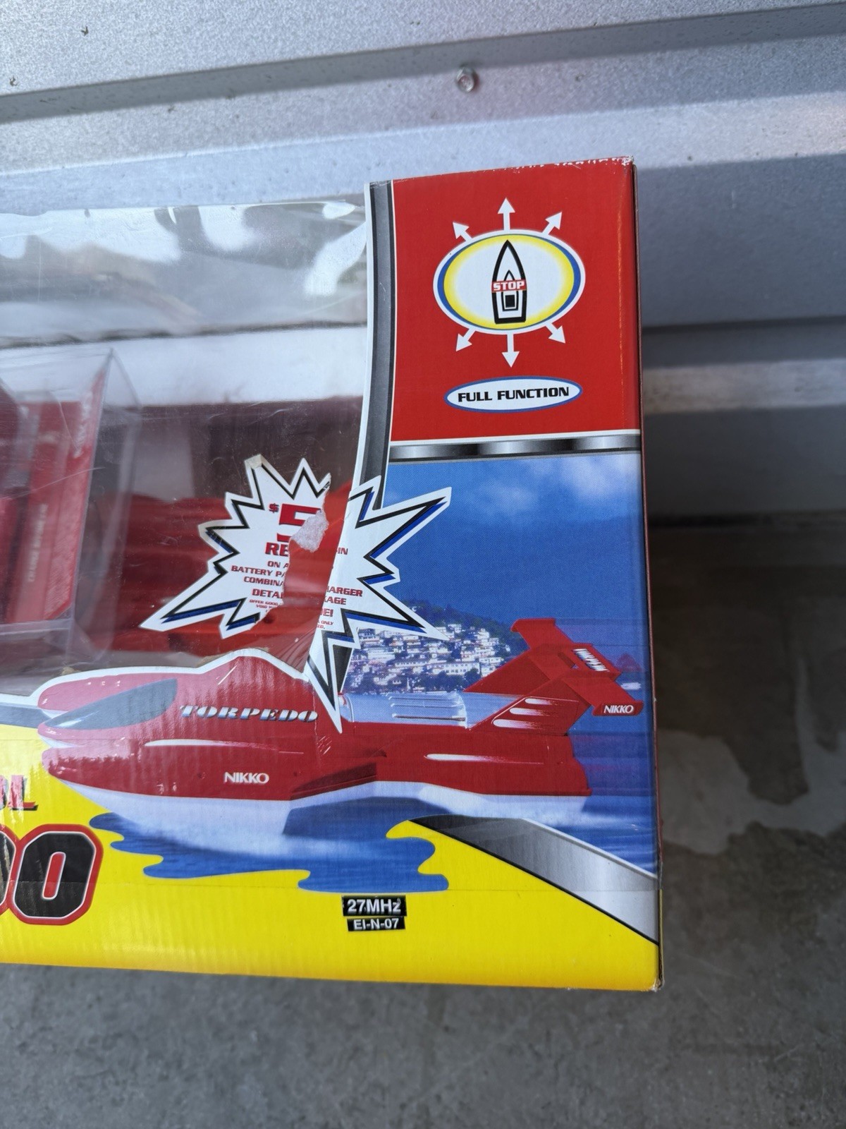 1. Brand: NIKKO 2. Item Description: Vintage SEALED NEW Styrofoam NIKKO Torpedo Hydroplane RC Racing Boat 49MHz 3. Condition: The package is factory sealed condition. There is no sign of tempering on the sealed tape on the package. This package is 100% brand new from the manufacturer. The photos are taken on actual item on sale. 4. Color: 5. Included Items: A. Included: Comes in original packaging B. Not Included: Nothing Missing 6. Suggested Retail Price: 7. Product Features: