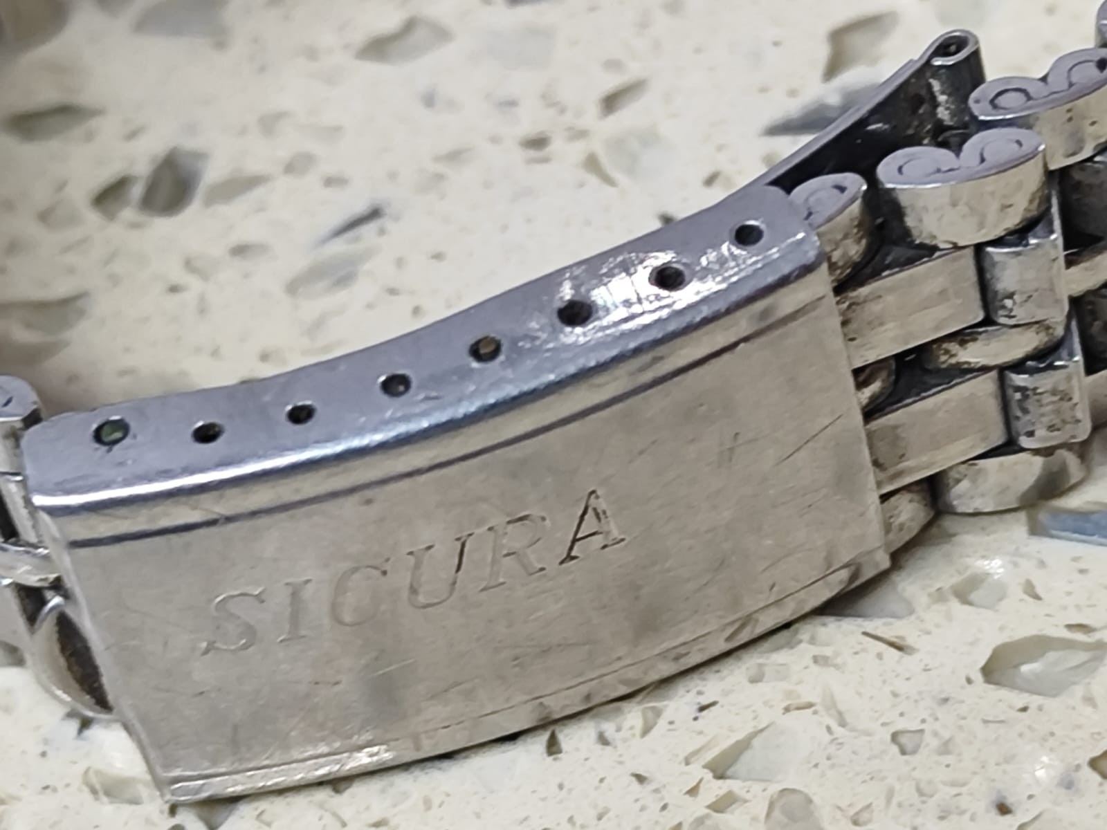 This Vintage SICURA Breitling Bracelet Watch is a classic stainless steel timepiece with a 19mm band width, perfect for a Sicura Diver model. Made in Switzerland in the 1970s, this wristwatch band is in silver color and features a diver theme, making it a stylish accessory for men who appreciate vintage watches. The compatibility with both Breitling and Sicura brands adds versatility to this piece, making it a unique addition to any watch collection.