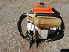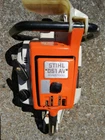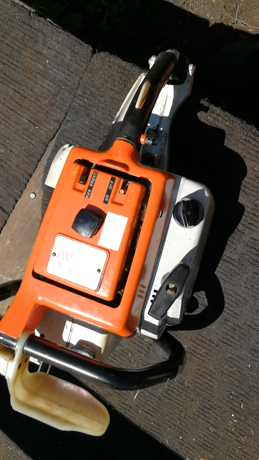 Collectors vintage Stihl 051av chainsaw with wrap handlebar and dual falling spikes. Nice looking saw overall. Nice collectors piece. Strong compression. Fires up in few pulls. Idles great. It is very smoky. Oils good. There is a patch on the side of the case. Nice looking piece for a collection. Did not cut with is. May or may not need carb work or other repairs. No bar or chain, but I have those that I can list. This did have a roller nose tip that I will list. 33 inch. Thanks for looking, Dave