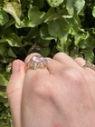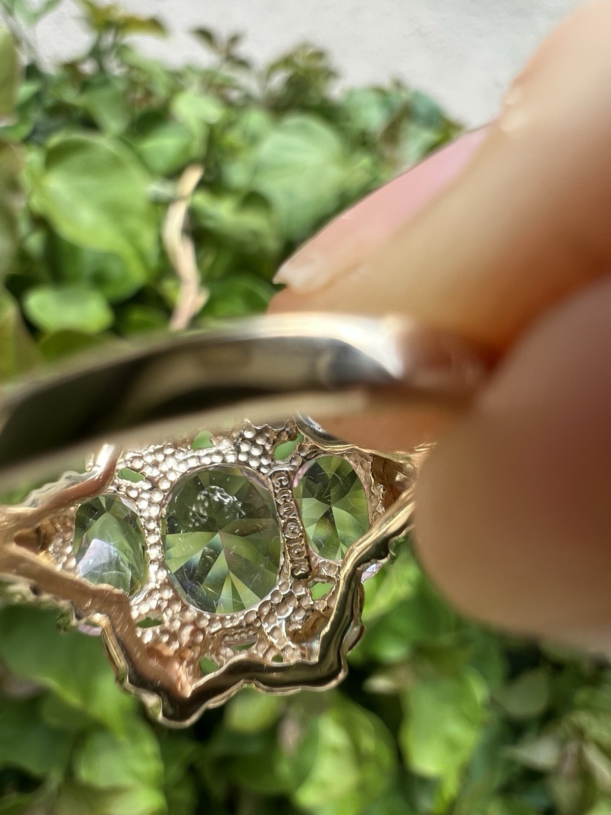 Rose de France amethyst trilogy ring. 10k yellow, green, and rose gold. Size 5.75. 4.14 grams. Beautiful iridescent light amethyst trilogy ring - confirmed by my jeweler. The type of amethyst is named Rose de France but these stones look more light, pink, and unique than their name suggests. Truly STUNNING! The ring is set in solid 10k black hills gold which is a style that includes yellow, rose and green gold. You can see the rose and green gold in the leaves and the yellow gold is the primary gold for the ring/band. In my (unprofessional) opinion this ring is likely from the 1940s/50s but may be older or newer though we can definitely date it as younger than 1870s (when black hills gold was first created). This piece feels like a special part of Americana as Black Hills gold really became popular in the US and was primarily mined from/made in South Dakota. Amethyst is the birthstone for February. Trilogy rings typically represent past, present, and future so can be a romantic or platonic gesture for a longstanding relationship. Please let me know if you have any questions! :)