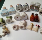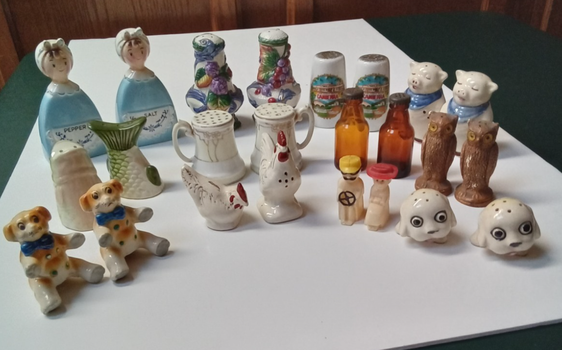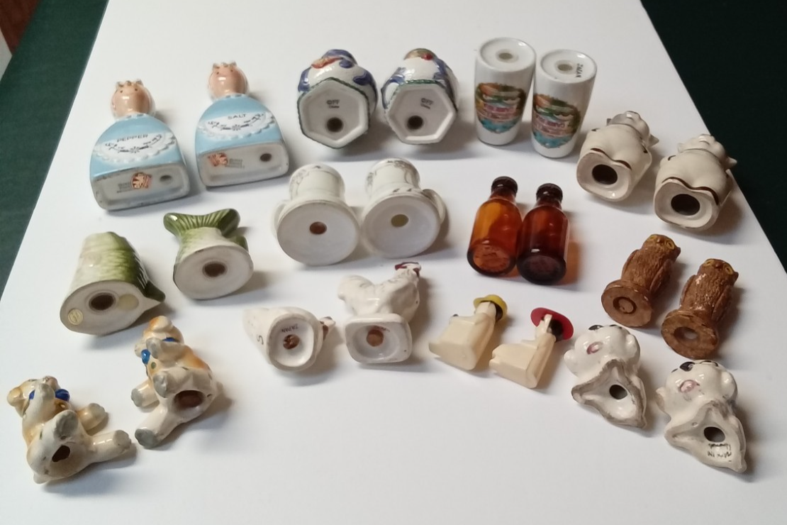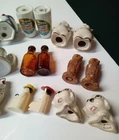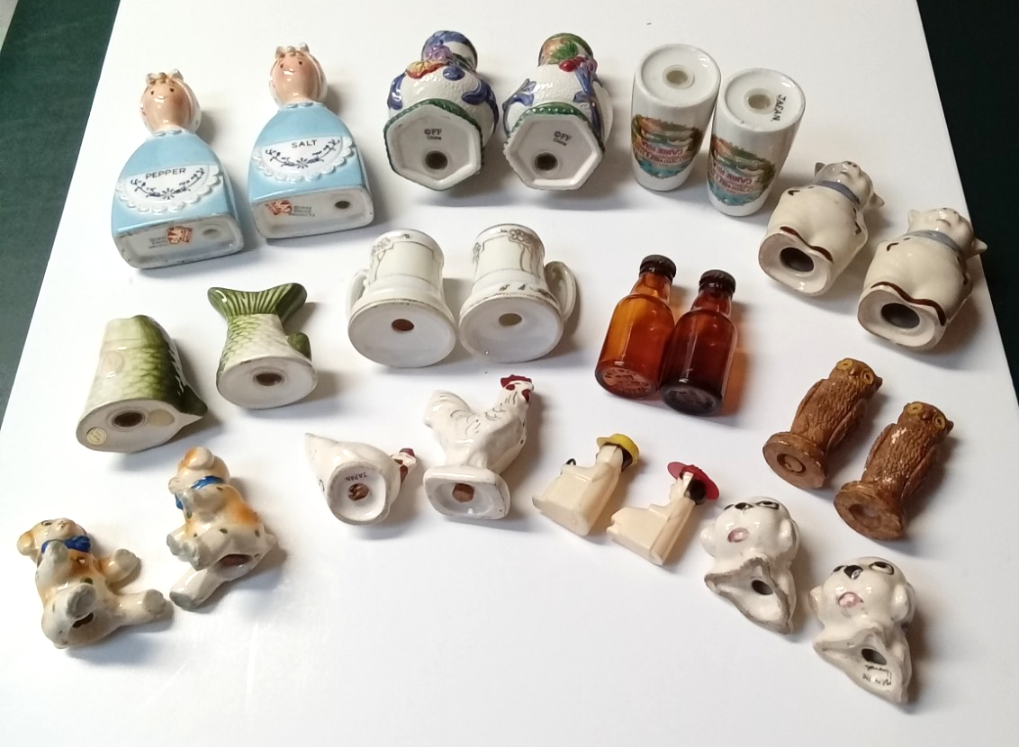 Vintage Salt and Pepper Shakers Some Made in Japan - Lot of 12 Pairs. In used condition with some signs of wear from previous use and age. The Davar brand set of girls has one with a glaze crack in the neck. The pair of owls have wear on the heads and ears. Some are stamped Japan. See photos.