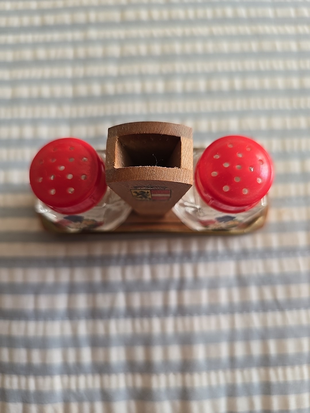 This vintage Salzburg salt and pepper shaker set with caddy holder features a charming design that adds a touch of nostalgia to any dining table. Made of glass, the shakers stand at 2.5 inches tall and come with a toothpick holder for added convenience. The set, which includes a base, is perfect for all occasions and is sure to be a unique addition to any kitchen or dining room.