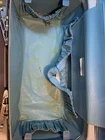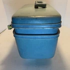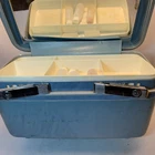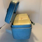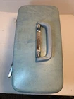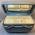 Fun kickin’ item for your overnight tryst or bridal trousseau - less common light powder blue - sturdy Vintage Samsonite PROFILE ( Denver Colorado!) Train Makeup Case - includes 2 Keys ( they work!) full Tray insert plus 3 little bottles and 2 toothbrush covers / full Mirror in lid - dates from the 1960s. Inside has a couple of condition notes, the back pocket has loose elastic, and of course some aroma of past perfumes - the lid flap needs a pop rivet ( we will be happy to do this if you ask!) outer has typical scuffing, sticker haze etc. Super cute!!! Oh, measures about 15 1/4” by 8” by 9”