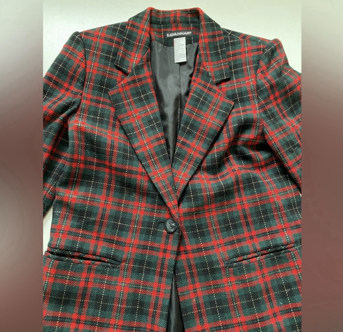 Vintage Savannah Red Green Plaid Wool Blend Holiday Christmas Blazer Women’s 2 P Gorgeous retro plaid blazer perfect for the holiday season! Red green gold plaid with a bit of sparkle in the gold single button Shoulder pads See photos for approximate measurements Very Good preowned condition Light wear - see photos Ships from a clean and smoke free home!