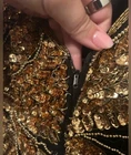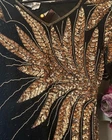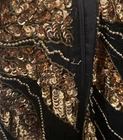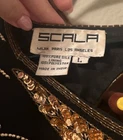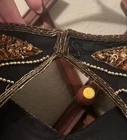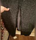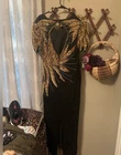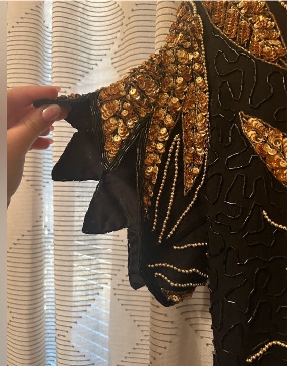 Stunning Vintage Scala beaded gown! Sun beading with scalloped sleeves. Black and gold. Back slit and has shoulder pads but those can easily be removed. Zipper and clasp. 2 beads have fallen off in the back (pictured, two tiny tiny tiny strings that the bead was on) Absolutely breathtaking