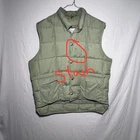 Item has a stain on the front, one missing back button piece, and two snags. Embrace the timeless appeal of a vintage Schott NYC vest, perfect for those with a penchant for classic Western and outdoor style. This medium-sized, solid green puffer jacket is designed to provide both comfort and durability. Filled with prime goose down, it offers excellent insulation, making it an ideal choice for any season, from the brisk fall days to the cool summer evenings. The vest features a practical snap closure, mid-length cut for ease of movement, and convenient zipped pockets to secure your essentials while on the go. Tailored for a regular fit, it suits a variety of occasions, from casual wear to outdoor adventures and workwear. Caring for this piece is a breeze with its dry clean only requirement, ensuring it remains a staple in your wardrobe for years to come.
